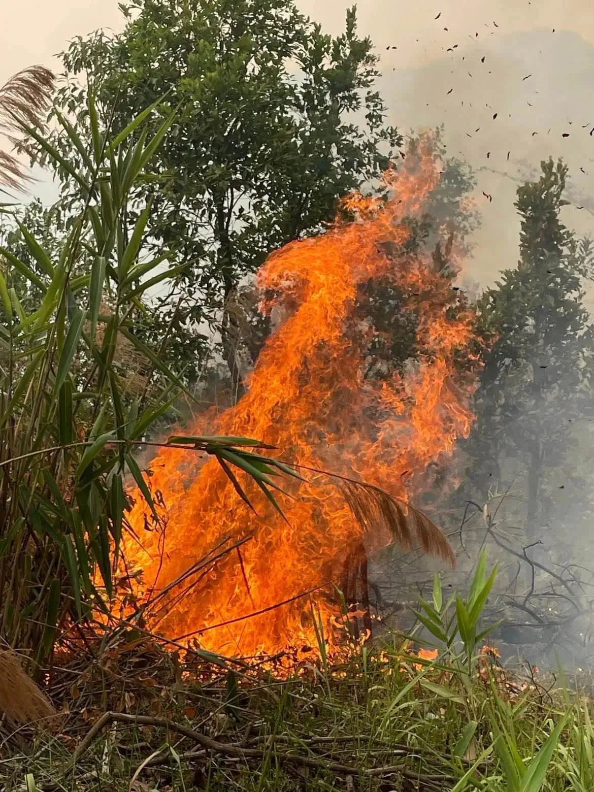 พอขับรถลึกเข้าไป เราพบเปลวไฟรุนแรงลุกลามขึ้นมาจากด้านล่างจนถึงถนน เปลวไฟสูงและไหม้ลามเร็วเมื่อมีลมพัดมา