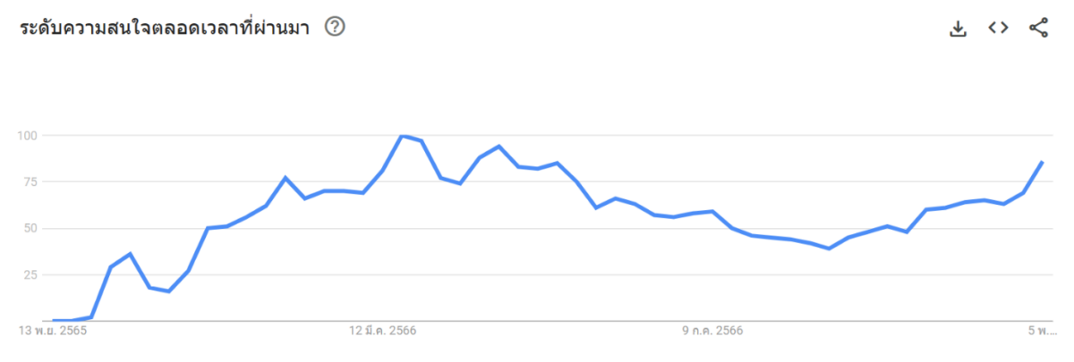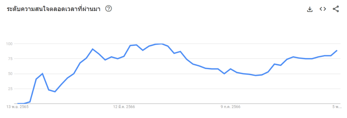 แต่ทั้งนี้ทั้งนั้น ล่าสุดผมพบอีกข้อมูลที่น่าสนใจ คือเวลาผมลองเข้าไปเล่นกับ ChatGPT มักจะเจอการเข้าถึงเว็บดังกล่าวค่อนข้างยากมากในบางช่วงเวลาสำหรับคนที่ไม่ได้สมัครสมาชิกระดับพรีเมียมเอาไว้ เพราะมีคนใช้เยอะแล้วเว็บรองรับไม่ไหว ด้วยความสงสัยใคร่รู้ ผมเลยลองค้นดูว่าในปี 2023 ที่ผ่านมาตามปกติคนจะเข้าใช้ช่วงไหน แล้วก็เจอว่าในกรณีประเทศอังกฤษ (ผมอยู่อังกฤษ) เว็บจะชุลมุนตั้งแต่ช่วงมีนาคมเป็นต้นมา ซึ่งก็ไม่น่าแปลกใจอะไร เพราะเป็นไปได้ว่า ChatGPT เพิ่งเปิดตัวในช่วงธันวาคม 2022 ดังนั้นช่วงต้นปี 2023 คนอาจจะยังไม่รู้จักเว็บไซต์มากนัก แต่ที่น่าสนใจคือความชุลมุนดังกล่าวลากยาวไปถึงเดือนมิถุนายน ก่อนจะตกลงในช่วงเดือนกรกฎาคม ก่อนจะกลับมาพีกอีกครั้งตั้งแต่กลางเดือนพฤศจิกายนเป็นต้นไป
