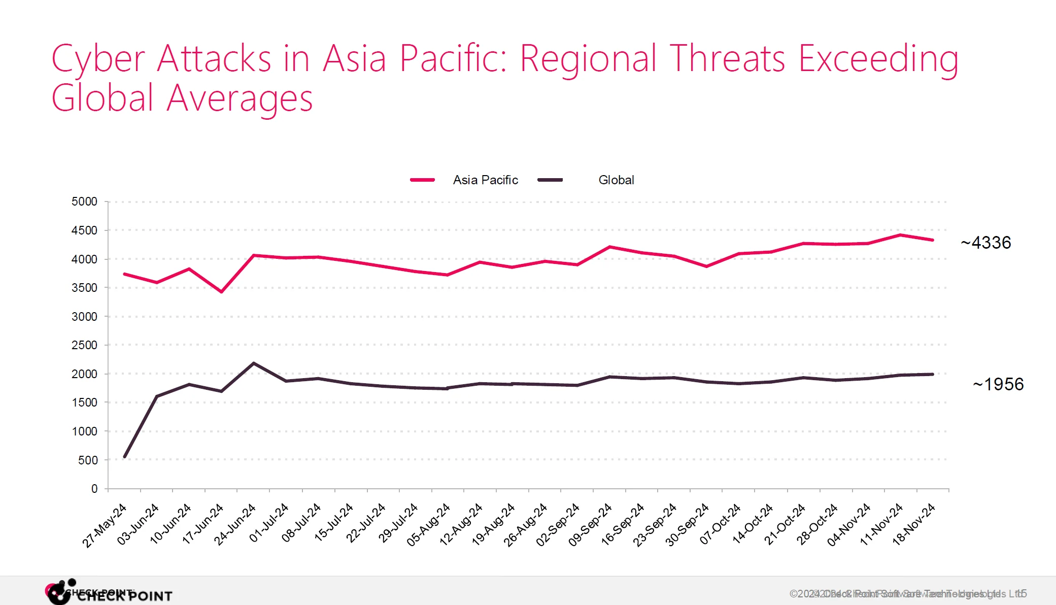 นอกจากนี้หากมองในกรอบระยะเวลาหกเดือนนับตั้งแต่พฤษภาคมถึงพฤศจิกายน 2024 Check Point ได้ค้นพบว่ามีการโจมตีทางไซเบอร์ทั่วโลกเกิดขึ้นโดยเฉลี่ยราว 1,965 ครั้งต่อสัปดาห์ อย่างไรก็ตามเมื่อเจาะลงมายังภูมิภาคเอเชียแปซิฟิกนั้นพบว่ามีการโจมตีทางไซเบอร์ที่สูงกว่าค่าเฉลี่ยโลกเกินสองเท่า โดยพบการโจมตีเฉลี่ยสูงถึงประมาณ 4,336 ครั้งต่อสัปดาห์ ซึ่งเป็นจำนวนที่เพิ่มจากช่วงเวลาเดียวกันในปีก่อนหน้าถึง 55%