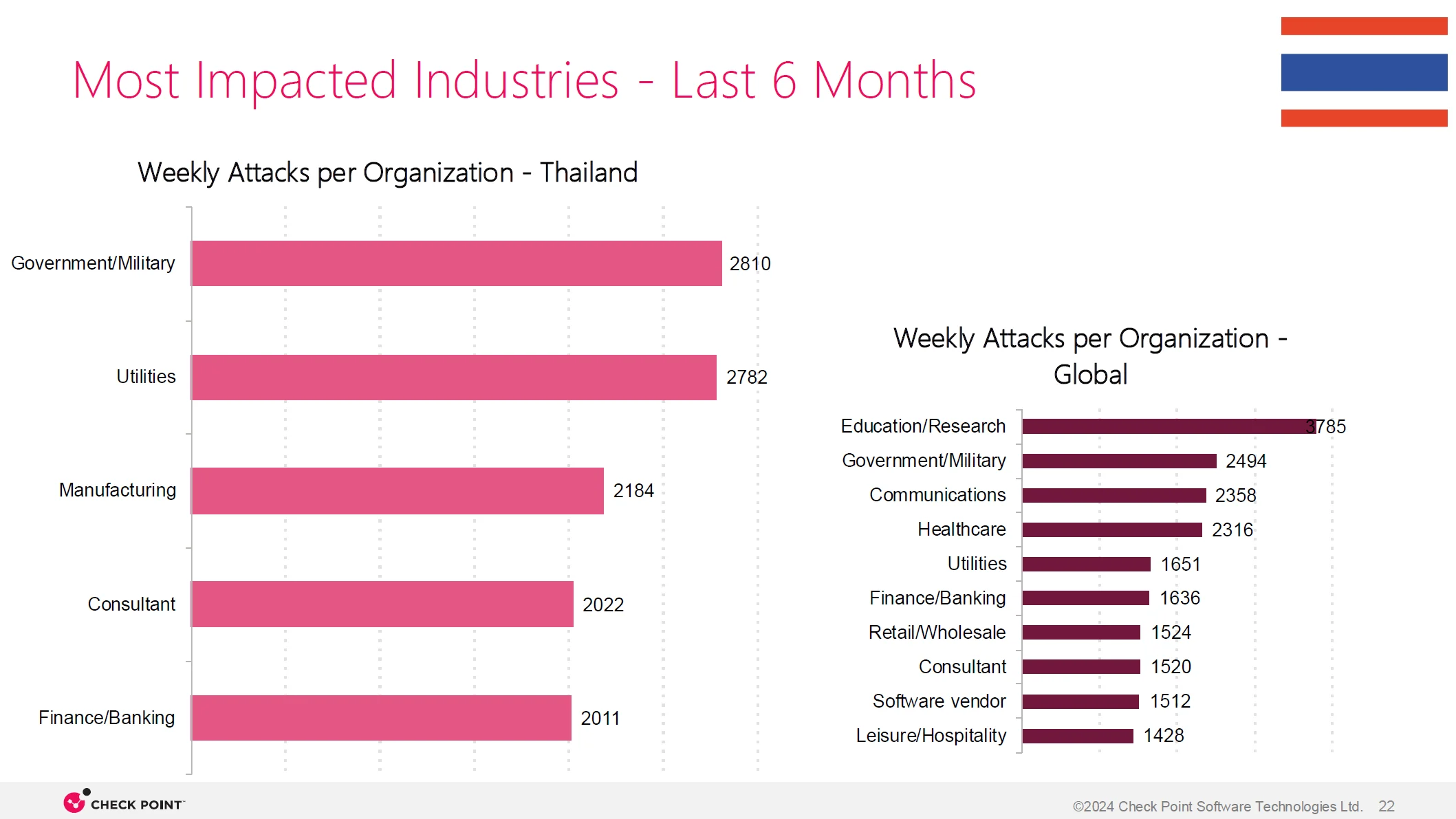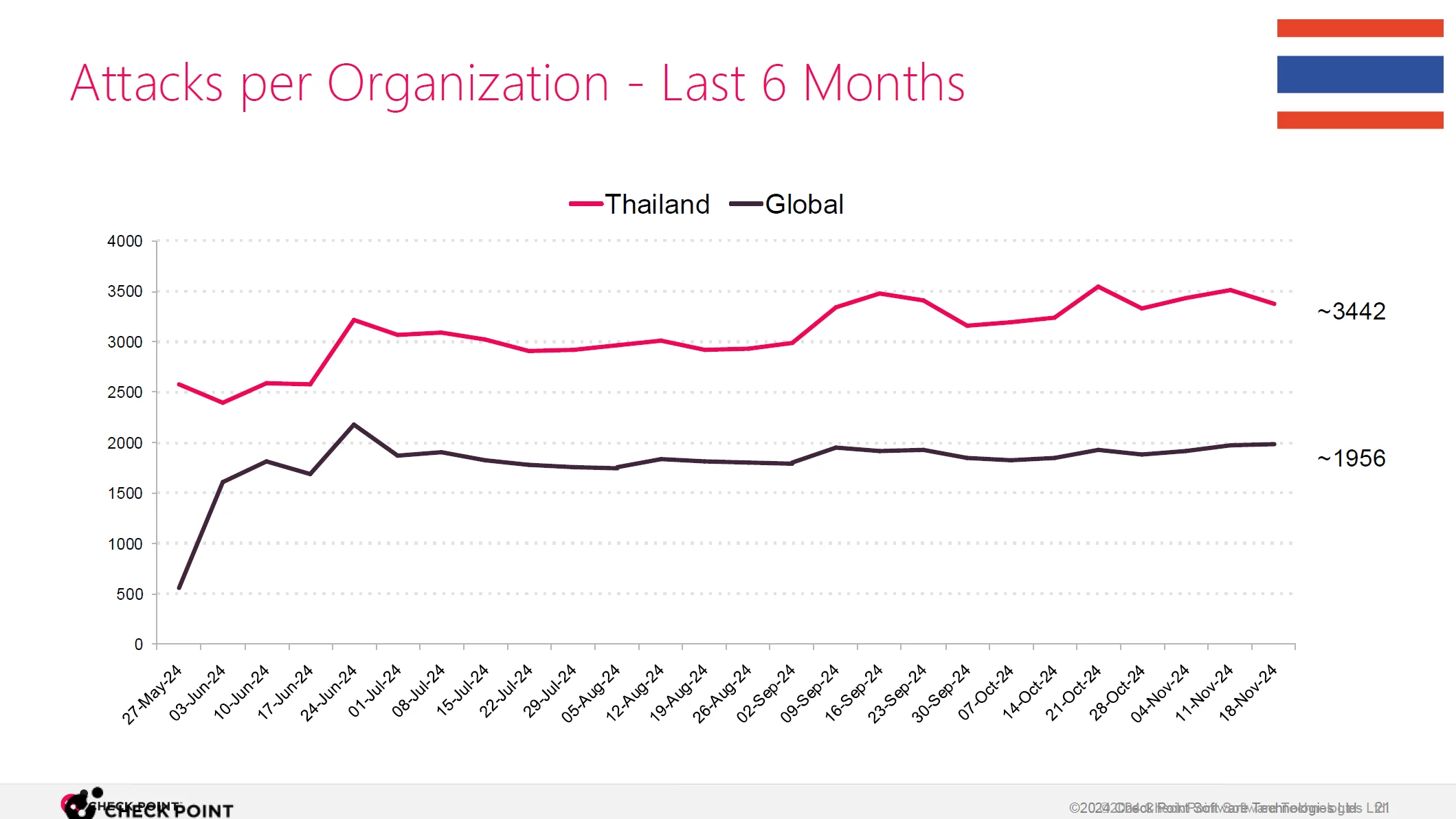 และเมื่อมองในภาพรวมของประเทศไทย ก็พบว่าในหกเดือนที่ผ่านมานั้นถูกโจมตีสูงกว่าค่าเฉลี่ยของโลกเกือบเท่าตัว โดยอยู่ที่ 3,442 ครั้งต่อสัปดาห์ แต่ยังต่ำกว่าค่าเฉลี่ยของภูมิภาคเอเชียแปซิฟิก
