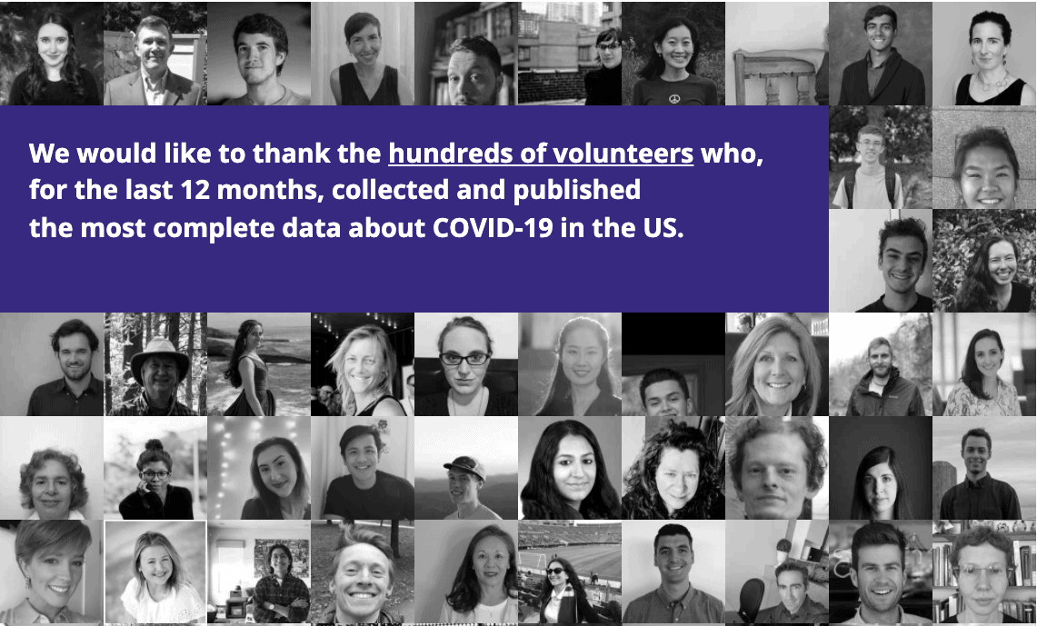 The Covid Tracking ได้สำนักข่าว The Atlantic เป็นเจ้าภาพ โดยโปรเจกต์นี้เปิดรับอาสาสมัครจากทั่วประเทศ และได้อาสาสมัครหลากหลายมาก ทั้งโปรแกรมเมอร์ นักวิทยาศาสตร์ข้อมูล บรรณารักษ์ นักเรียนม.ปลาย หรืออดีตผู้จัดการโรงแรม รวมกันเกือบ 300 คน มาช่วยกันรวบรวมข้อมูลการจัดการโควิด-19 จากทุกมลรัฐ เช่น ข้อมูลตรวจเชื้อ การติดเชื้อ การเข้ารักษา การเสียชีวิต การติดตามข้อมูลตามเชื้อชาติ และข้อมูลสถานดูแลผู้สูงอายุ