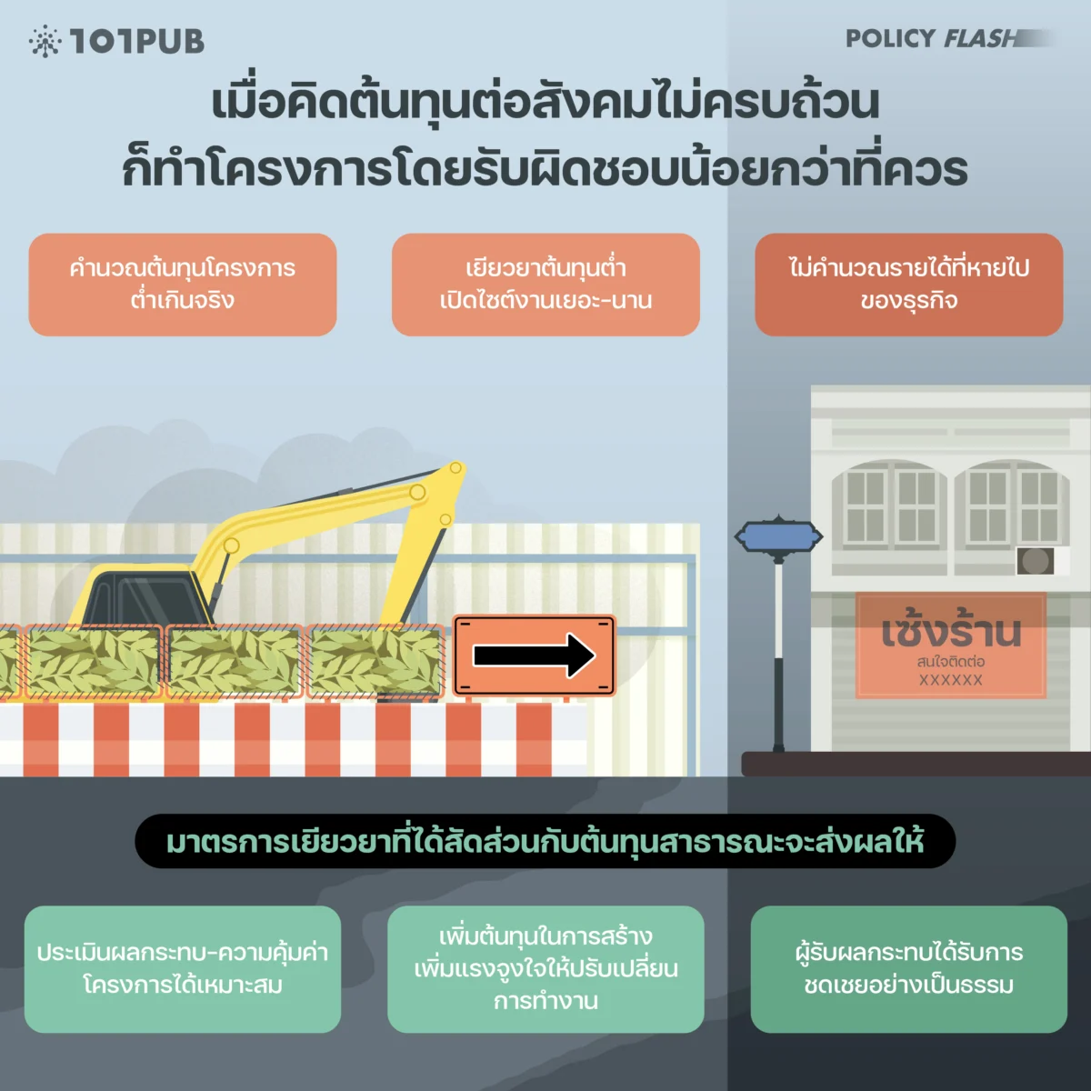 ต้นทุนของการก่อสร้างนั้นไม่ได้มีเพียงแค่ค่าวัสดุอุปกรณ์เท่านั้น แต่ยังมีต้นทุนสาธารณะอื่นๆ รายล้อมโครงการขนาดใหญ่เหล่านี้ด้วย โดยเฉพาะกับเศรษฐกิจเดินเท้าและธุรกิจรายย่อยที่มักถูกละเลยในการประเมินโครงการและการวางมาตรการเยียวยา 101 PUB จึงขอชวนสำรวจการละเลยผลกระทบเหล่านี้ และเราควรมีวิธีชดเชยผลกระทบเหล่านี้อย่างไร