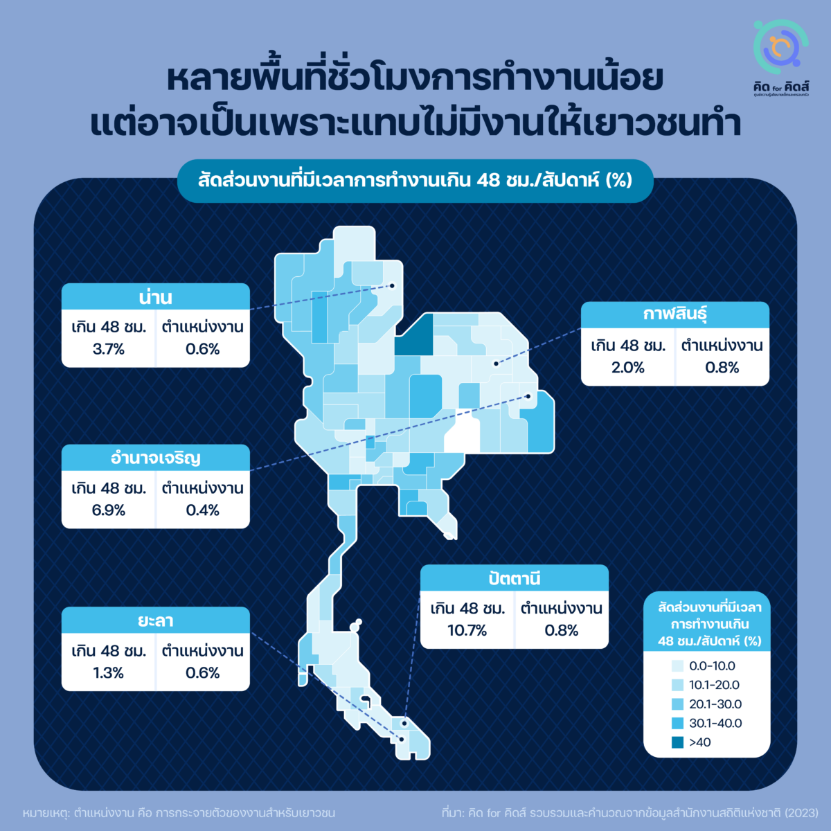 อย่างไรก็ตาม ยังมีอีกหลายพื้นที่ที่มีสัดส่วนงานที่มีเวลาการทำงานเกินมาตรฐานที่น้อย หากแต่ไม่ได้เป็นเพราะพื้นที่เหล่านี้มีงานทักษะสูงเยอะ แต่เป็นเพราะพื้นที่เหล่านี้อาจแทบไม่มีตำแหน่งงานให้เยาวชนได้ทำเลย เพราะเมื่อดูการกระจายตัวของตำแหน่งงานสำหรับเยาวชนอายุ 15-25 ปี ทั่วประเทศไทยจะพบว่าหลายพื้นที่ที่มีสัดส่วนงานที่มีเวลาการทำงานเกิน 48 ชั่วโมงต่อสัปดาห์ ต่ำกว่าค่าเฉลี่ย กลับมีตำแหน่งงานในพื้นที่ไม่ถึง 1% ของงานที่มีทั้งหมดในประเทศ อาทิ ปัตตานี (0.8%) กาฬสินธุ์ (0.8%) ยะลา (0.6%) น่าน (0.6%) และอำนาจเจริญ (0.4%)