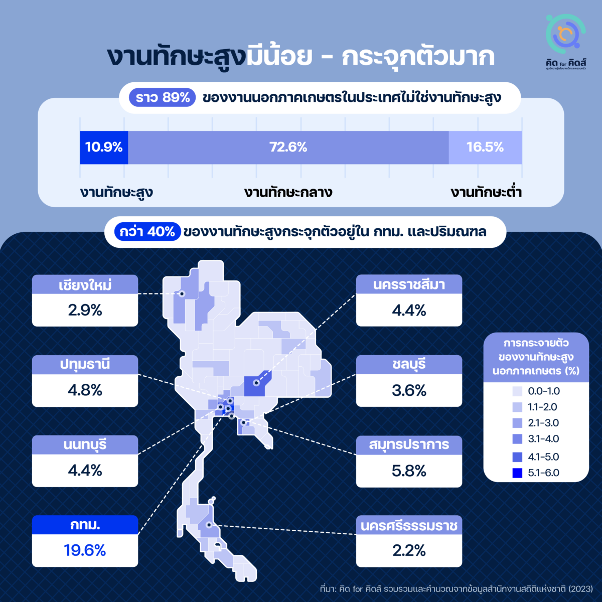 ยิ่งไปกว่านั้น งานทักษะสูงนอกภาคเกษตรดังกล่าวนี้ยังมีความกระจุกตัวสูงมาก เพราะเมื่อดูการกระจายตัวของงานทักษะสูงนอกภาคเกษตรในประเทศไทยจะพบว่า 40.1% ของงานเหล่านี้กระจุกตัวอยู่แค่ในพื้นที่กรุงเทพมหานครและปริมณฑล นอกจากนี้ งานทักษะสูงนอกภาคเกษตรที่เหลือส่วนใหญ่กระจุกตัวตามหัวเมืองใหญ่ในภูมิภาคต่างๆ อาทิ นครราชสีมา (4.4%), ชลบุรี (3.6%), เชียงใหม่ (2.9%), นครศรีธรรมราช (2.2%)