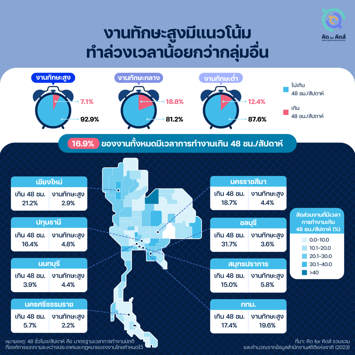 ขณะที่หลายพื้นที่ที่เหลือที่มีงานทักษะสูงอยู่น้อยมีแนวโน้มที่จะมีสัดส่วนงานที่มีเวลาการทำงานสูงเกินกว่ามาตรฐานมาก อาทิ จังหวัดเลย ซึ่งมีงานทักษะสูงเพียง 0.3% ของงานทักษะสูงในประเทศ แต่มีสัดส่วนงานที่มีเวลาการทำงานเกินมาตรฐานสูงถึง 46% ของตำแหน่งงานในพื้นที่