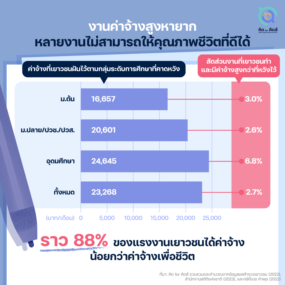 ที่มา: คิด for คิดส์ รวบรวมและคำนวณจากข้อมูลผลสำรวจเยาวชน (2022), สำนักงานสถิติแห่งชาติ (2023), และกษิดิ์เดช คำพุช (2022)