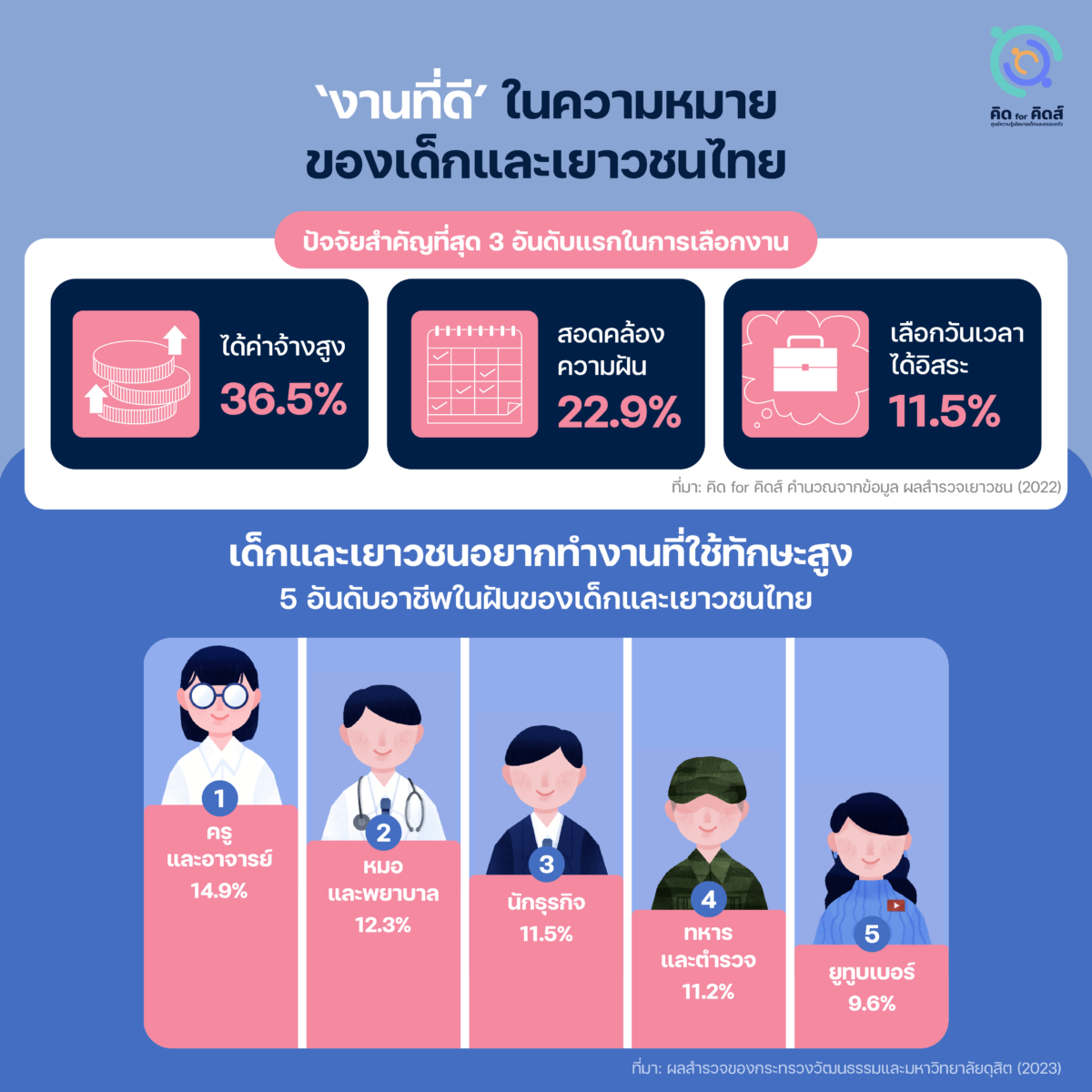ศูนย์ความรู้นโยบายเด็กและครอบครัว ‘คิด for คิดส์’ โดยความร่วมมือของ 101 Public Policy Think Tank (101 PUB) และสำนักสนับสนุนสุขภาวะเด็ก เยาวชน และครอบครัว สสส. ชวนสำรวจความฝันด้านอาชีพการงานของเยาวชนไทยผ่านผลสำรวจเยาวชน 2022 พร้อมทั้งชวนมองดูสถานการณ์ตลาดแรงงานในโลกความเป็นจริงที่ทำให้ ‘งานที่ดี’ อาจเป็นเพียงความฝันของเด็กและเยาวชนไทยส่วนใหญ่