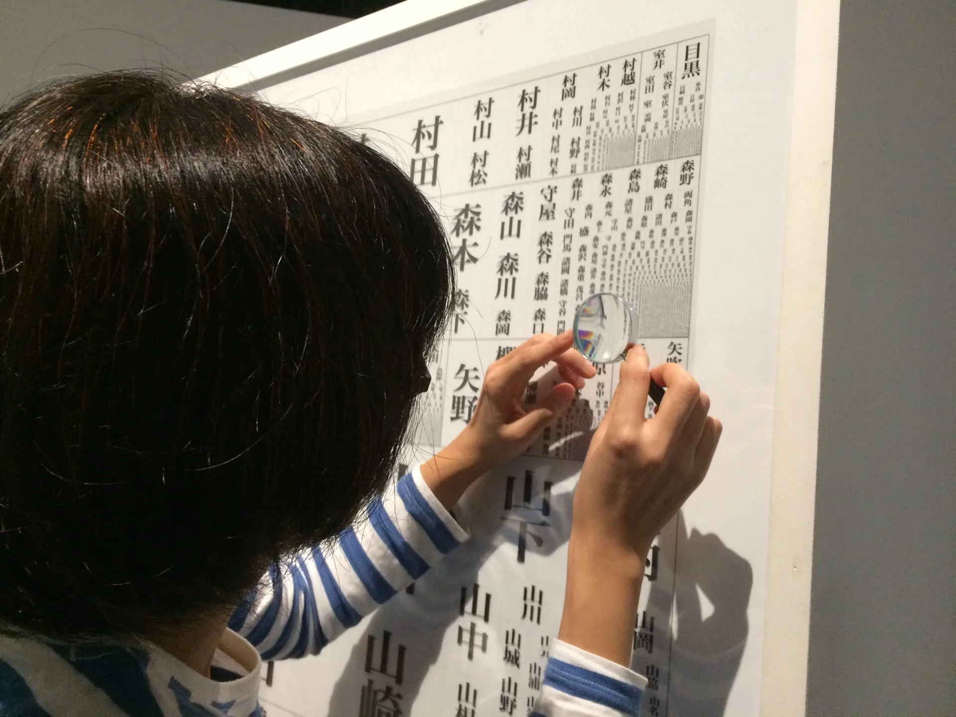 โซนนี้พาไปสังเกต ‘ตัวอักษร’ (ซ้าย) ชิ้นนี้ว่าด้วยระยะห่างในการมอง ถ้ามองไกลจะเห็นภาพ แต่ถ้ามองใกล้จะเห็นคำ (ขวา) อีกชิ้นเอาตัวอักษรญี่ปุ่นมาขยายตั้งแต่ใหญ่เบิ้ม และหดเล็กจนต้องใช้แว่นขยายส่อง