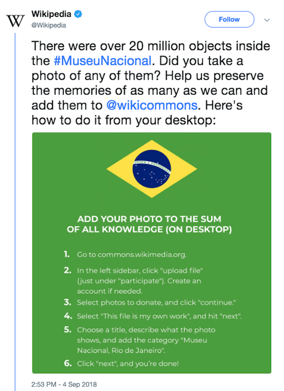 ในฝั่ง Wikipedia ก็กำลังทวีตประกาศข้อความเช่นเดียวกัน หนังสือพิมพ์บราซิลรายงานว่าขณะนี้มีภาพถ่ายนับพันถูกส่งไปในช่องทางต่างๆ ทั้งจากนักท่องเที่ยว คนท้องถิ่น หรือแม้แต่หน่วยงานใหญ่ อย่าง National Geographic UNESCO หรือรัฐบาลฝรั่งเศส ก็กำลังยื่นมือเข้ามาช่วยเหลือภารกิจชุบชีวิตพิพิธภัณฑ์ในครั้งนี้