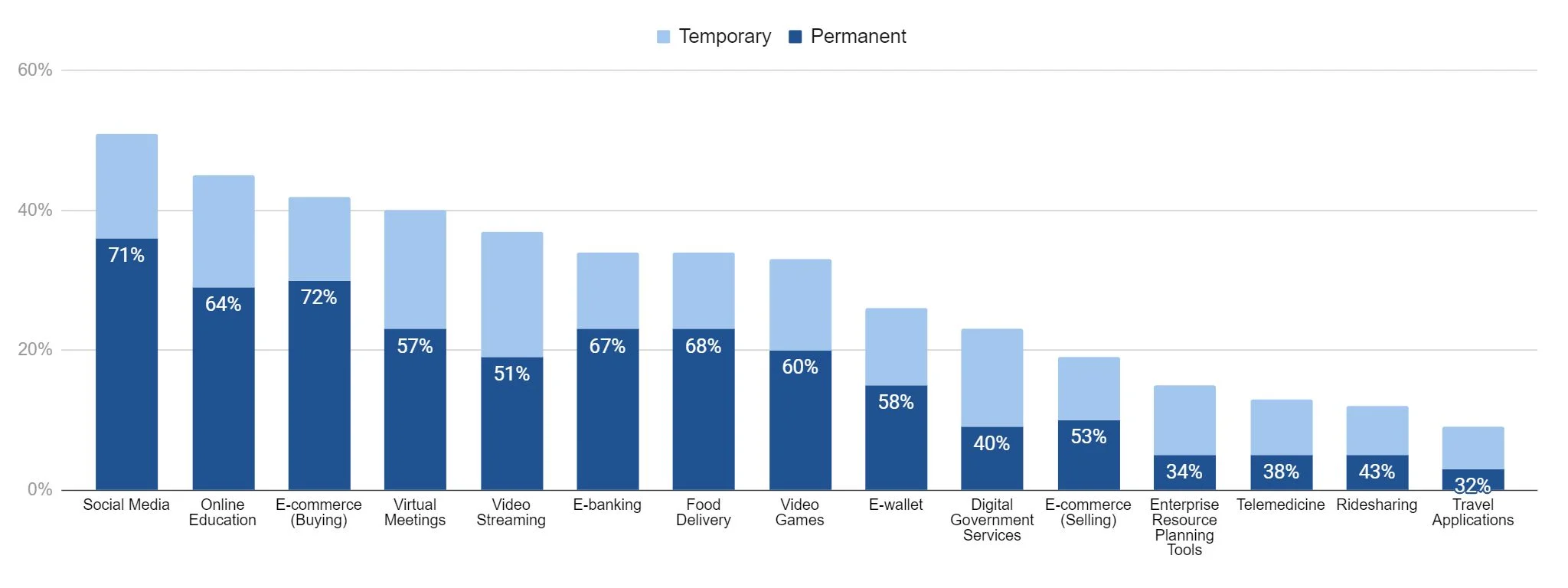 ข้อมูลนี้ได้มาจากคำถามในแบบสำรวจที่ถามคนเจนฯ Y และเจนฯ Z ว่า คิดว่าการใช้แพลตฟอร์มต่างๆ ในช่วงโควิด-19 (ไม่ว่าจะเพิ่มขึ้นหรือ ลดลงก็ตาม) จะเป็นการเปลี่ยนแปลงชั่วคราวหรือถาวร