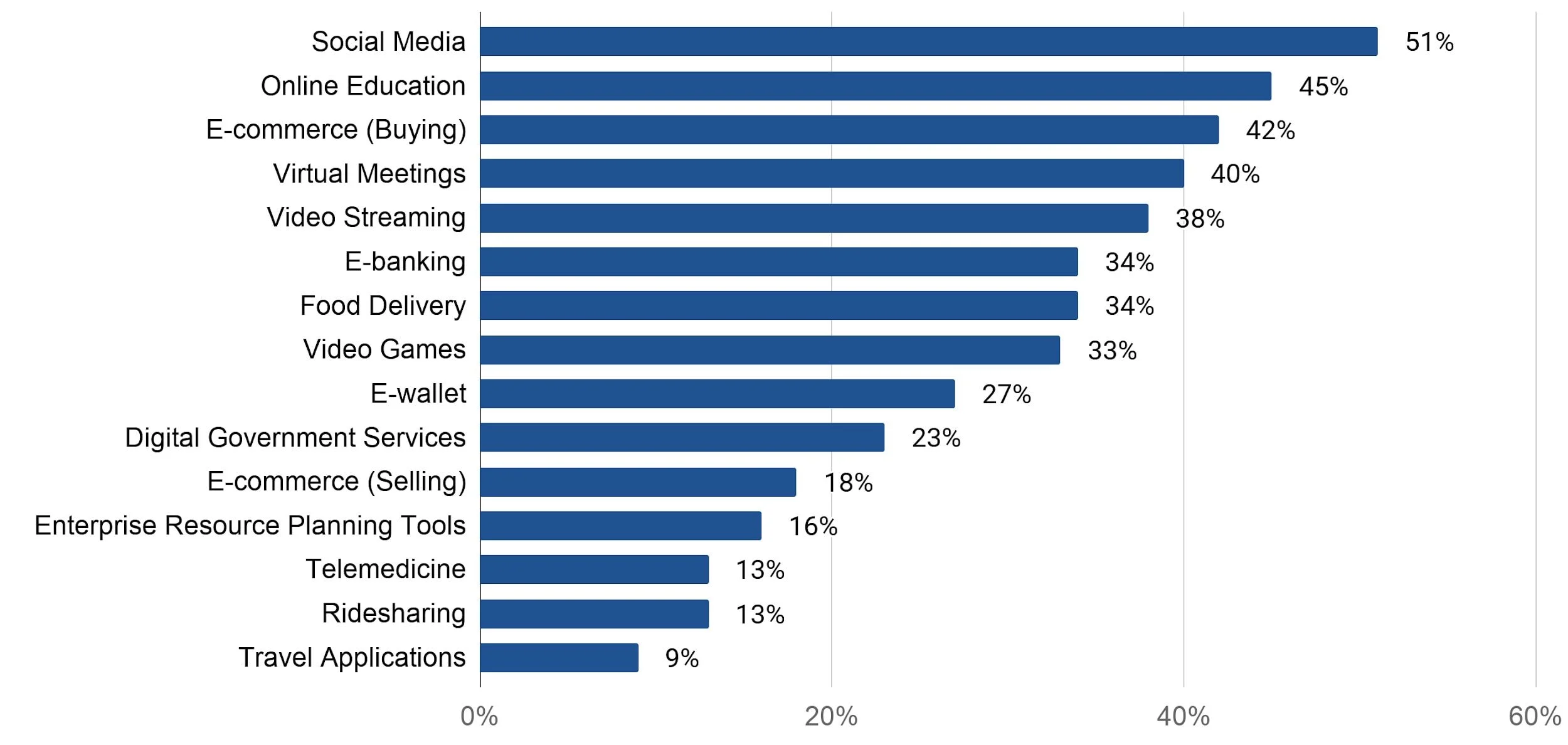 การศึกษาชี้ให้เห็นว่า แพลตฟอร์มดิจิทัลที่มีผู้ใช้เข้มข้นขึ้นจากเดิมมากที่สุด 5 อันดับแรกได้แก่ แอปพลิเคชันกลุ่มโซเชียลมีเดีย เรียนออนไลน์ ซื้อของผ่านแพลตฟอร์มอีคอมเมิร์ซ ประชุมออนไลน์ และดูหนังหรือซีรีส์ออนไลน์ตามลำดับ ตามมาด้วยกลุ่มอีเพย์เมนต์ และบริการส่งอาหาร (ภาพที่ 1)