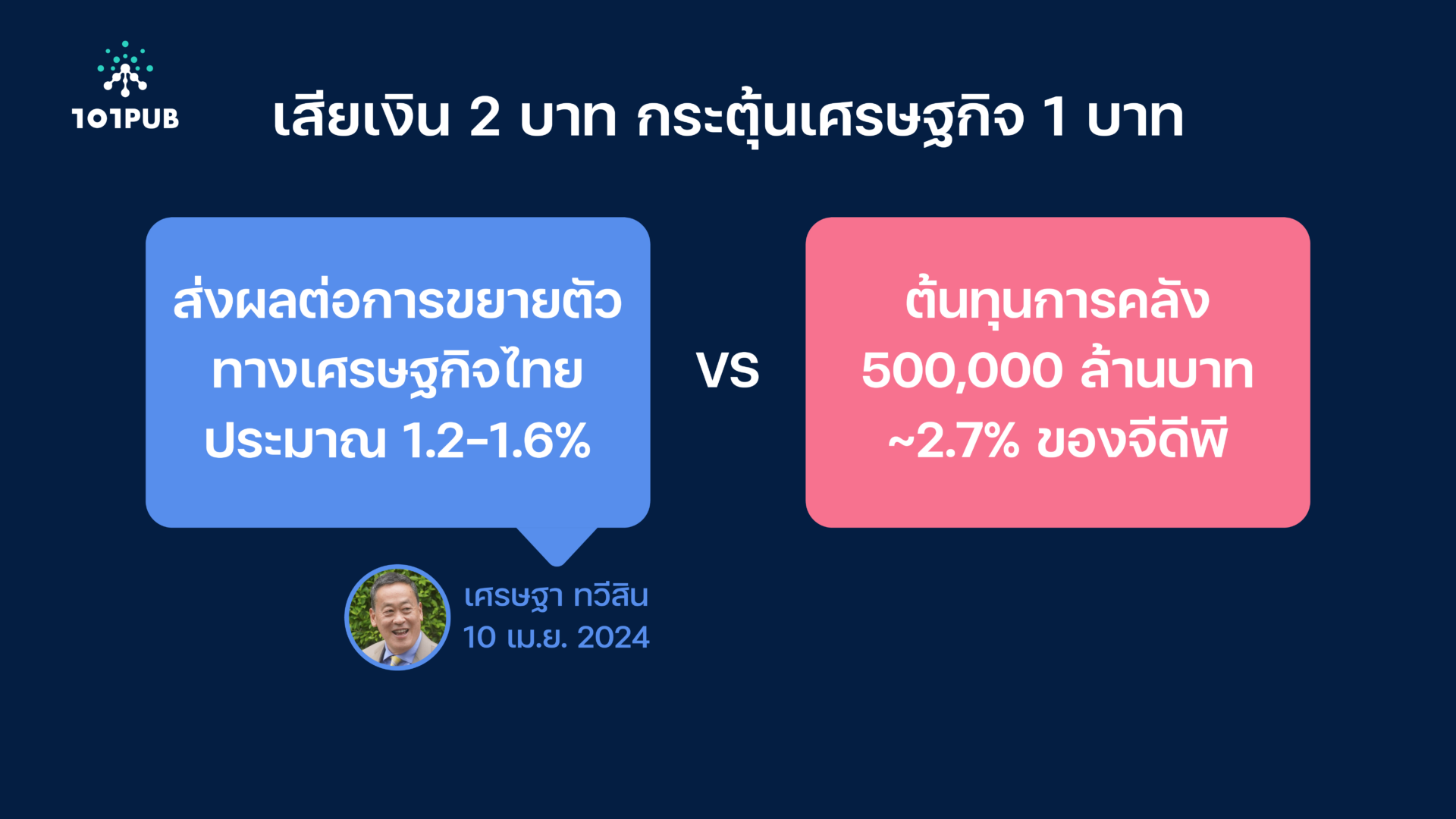 ทว่า ต้นทุนเงิน 500,000 ล้านบาทที่ใช้ไปนั้น คิดเป็น 2.7% ของขนาดเศรษฐกิจต่อปี เท่ากับว่าเรากำลังใส่เงินเข้าไป 2 บาทแต่จะได้ผลลัพธ์เพียง 1 บาท ซึ่งสอดคล้องกับทิศทางตัวเลขในอดีตและประสบการณ์ต่างประเทศ