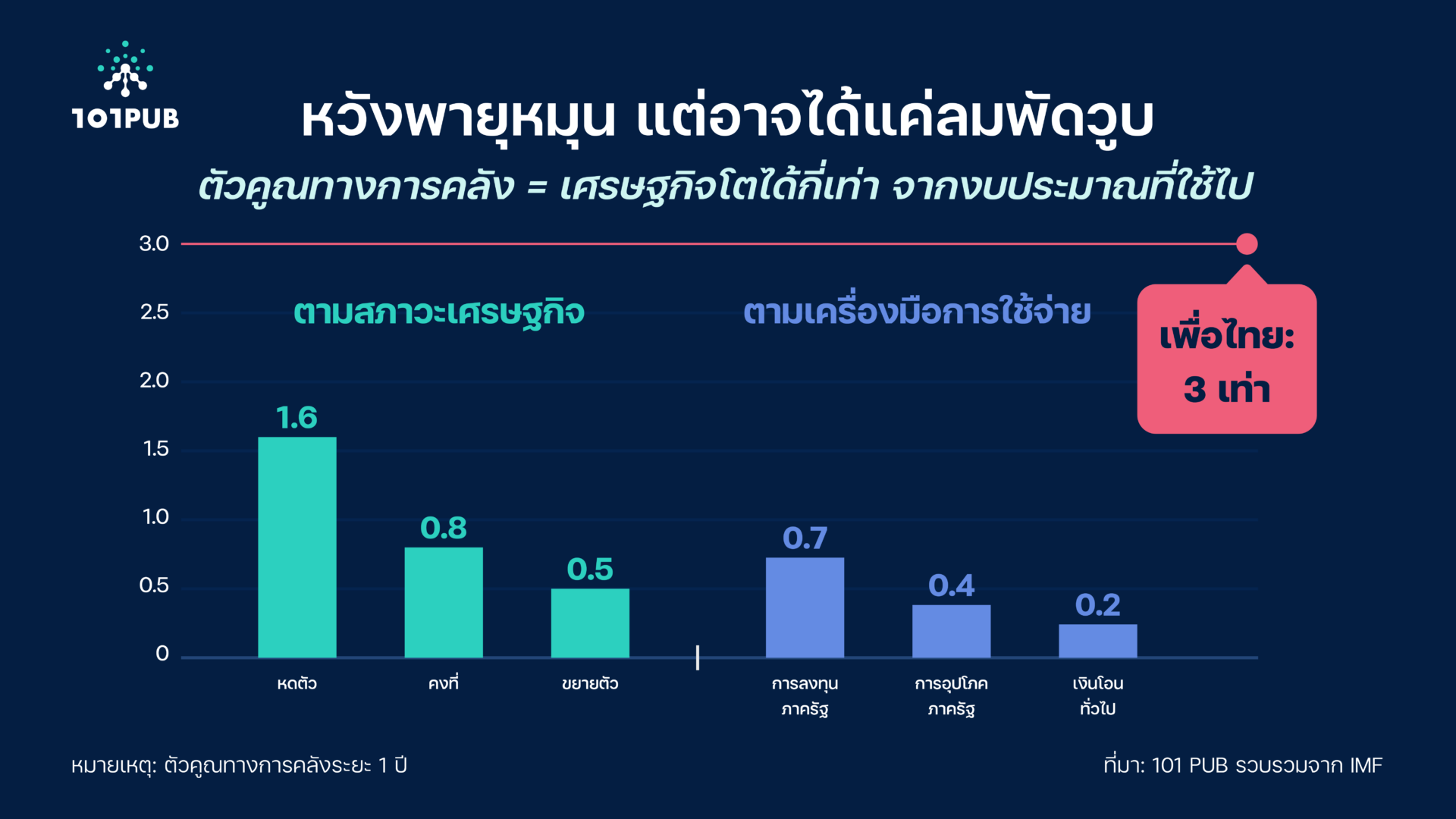 ↑2 | ธิติ เกตุพิทยา, ชิดชนก อันโนนจารย์ และทศพล ต้องหุ้ย. 2015. แรงกระตุ้นของนโยบายการคลังปี 2558-2559. FAQ Issue 106. สำนักงานประมาณของรัฐสภา. คู่มือการวิเคราะห์ผลกระทบของการใช้จ่ายภาครัฐต่อ GDP โดยตัวคูณทางการคลัง (Fiscal Multipliers). 2564. |
