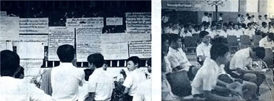 2. เรื่องปัญหาสังคมที่เน้นเรื่องปัญหาชาวนาและกรรมกรนั้น ปรากฏทัศนคติของนักเรียนว่า ชาวนาเป็นคนสำคัญของชาติร้อยละ 44 และเห็นด้วยกับการเรียกร้องการขึ้นค่าแรงของกรรมกรร้อยละ 48 นอกจากนี้ในแง่ของสื่อมวลชนในบริบทของรัฐบาลหลัง 14 ตุลา นักเรียนระบุว่ายังมีข้อบกพร่องในการนำเสนอข้อเท็จจริงควรปรับปรุงร้อยละ 44 ทั้งนี้ นักเรียนกลับให้ความสนใจการเมืองมากกว่าปัญหาความยากจน เช่น แสดงทัศนคติเรื่องปัญหาของสลัมว่าเป็นเรื่องธรรมดาถึงร้อยละ 47