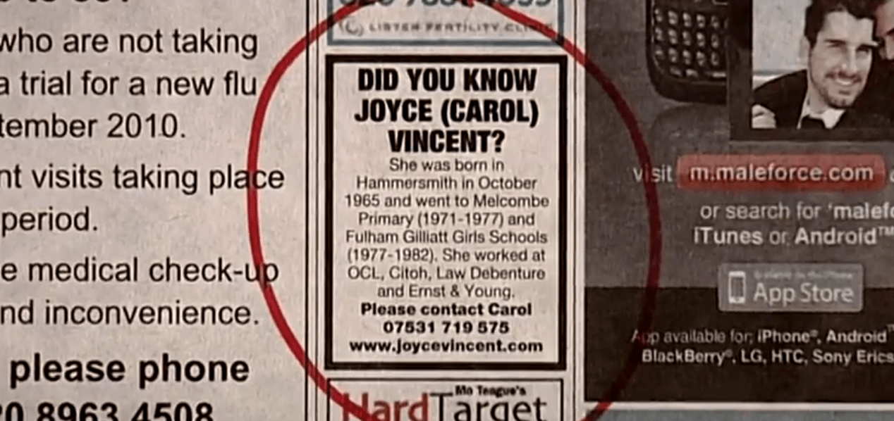 ชื่อของเธอคือ จอยซ์ วินเซนต์ หญิงสาววัย 38 ผู้เสียชีวิตไป 3 ปีโดยที่คนรอบข้างไม่รู้ตัว