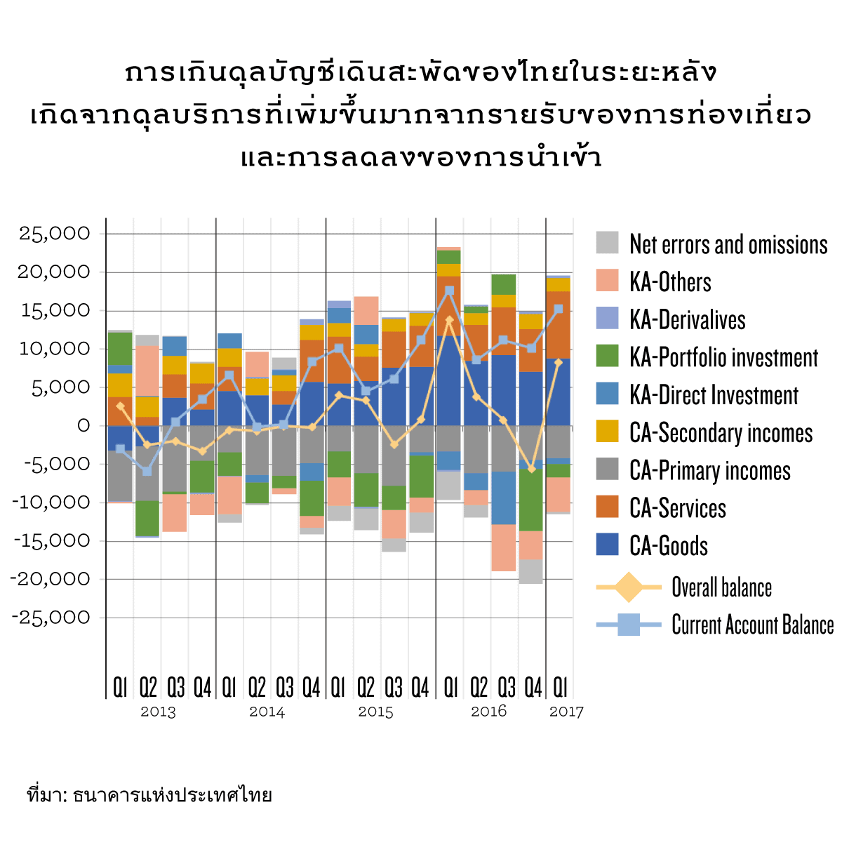แต่ถ้าเราไปดูไส้ในจะพบว่า การเกินดุลบัญชีเดินสะพัดที่เพิ่มขึ้นมากมาจากสองส่วนใหญ่ๆ คือ (1) การเพิ่มขึ้นของดุลบริการ นั่นคือ การท่องเที่ยว และ (2) การลดลงของการนำเข้าสินค้า ซึ่งมาจากราคาน้ำมันที่ลดลงไปมาก และเศรษฐกิจในประเทศที่ชะลอลงและการลงทุนที่หายไป