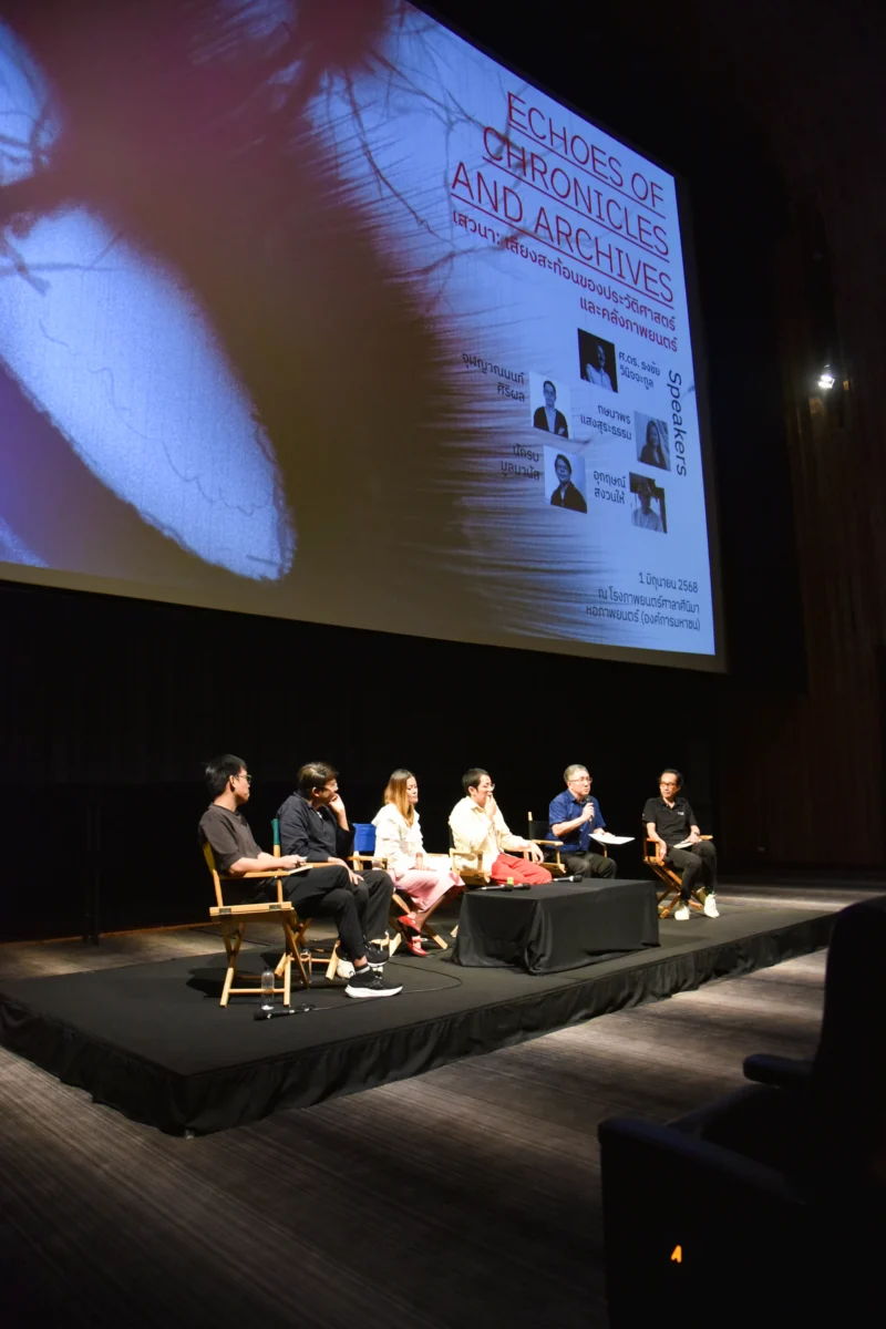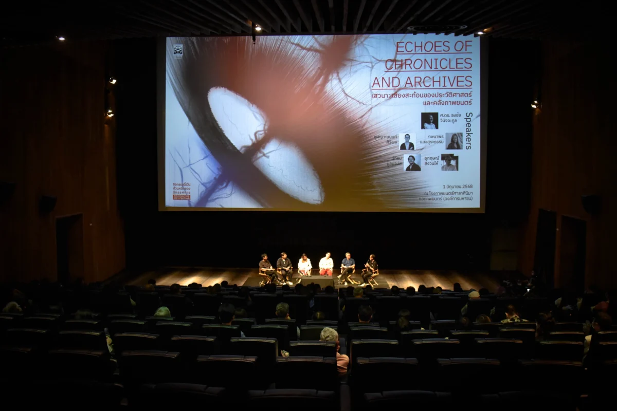 เมื่อวันที่ 1 มิถุนายนที่ผ่านมา หอภาพยนตร์จัดงาน ECHOES OF CHRONICLES AND ARCHIVES เสวนา: เสียงสะท้อนของประวัติศาสตร์และคลังภาพยนตร์ ส่วนหนึ่งของนิทรรศการวิดีโอจัดวาง Archival Time on Our Retina ที่ชวนสำรวจประเด็นทางประวัติศาสตร์ผ่านภาพเคลื่อนไหวในภาพยนตร์ อันแนบชิดเป็นหนึ่งเดียวกับการเปลี่ยนผ่านทางการเมืองในหลายทศวรรษของประเทศไทย โดยมี ธงชัย วินิจจะกูล ศาสตราจารย์กิตติคุณแห่งภาควิชาประวัติศาสตร์ มหาวิทยาลัยวิสคอนซิน-แมดิสัน ร่วมสนทนากับศิลปินที่จัดแสดงผลงานในนิทรรศการอย่าง จุฬญาณนนท์ ศิริผล และ กษมาพร แสงสุระธรรม เจ้าของผลงาน ‘อินทรีแดง แสงมรกต: บทเรียนจากคลังข้อมูล’ สำรวจภาพความเป็นวีรบุรุษและความเป็นชายในยุคสงครามเย็นกับมวยไทย, นักรบ มูลมานัส กับงาน All the poetry and the pity of the scene ศิลปะคอลลาจที่สะท้อนภาพการเปลี่ยนผ่านของสังคม และ อุกฤษณ์ สงวนให้ เจ้าของผลงาน Trip After ที่จับจ้องไปยังช่วงเวลาการฉายหนังกลางแปลงในภาคอีสานผ่านจดหมายเหตุยุคสงครามเย็น ดำเนินรายการโดย ก้อง ฤทธิ์ดี รองผู้อำนวยการหอภาพยนตร์ (องค์การมหาชน)