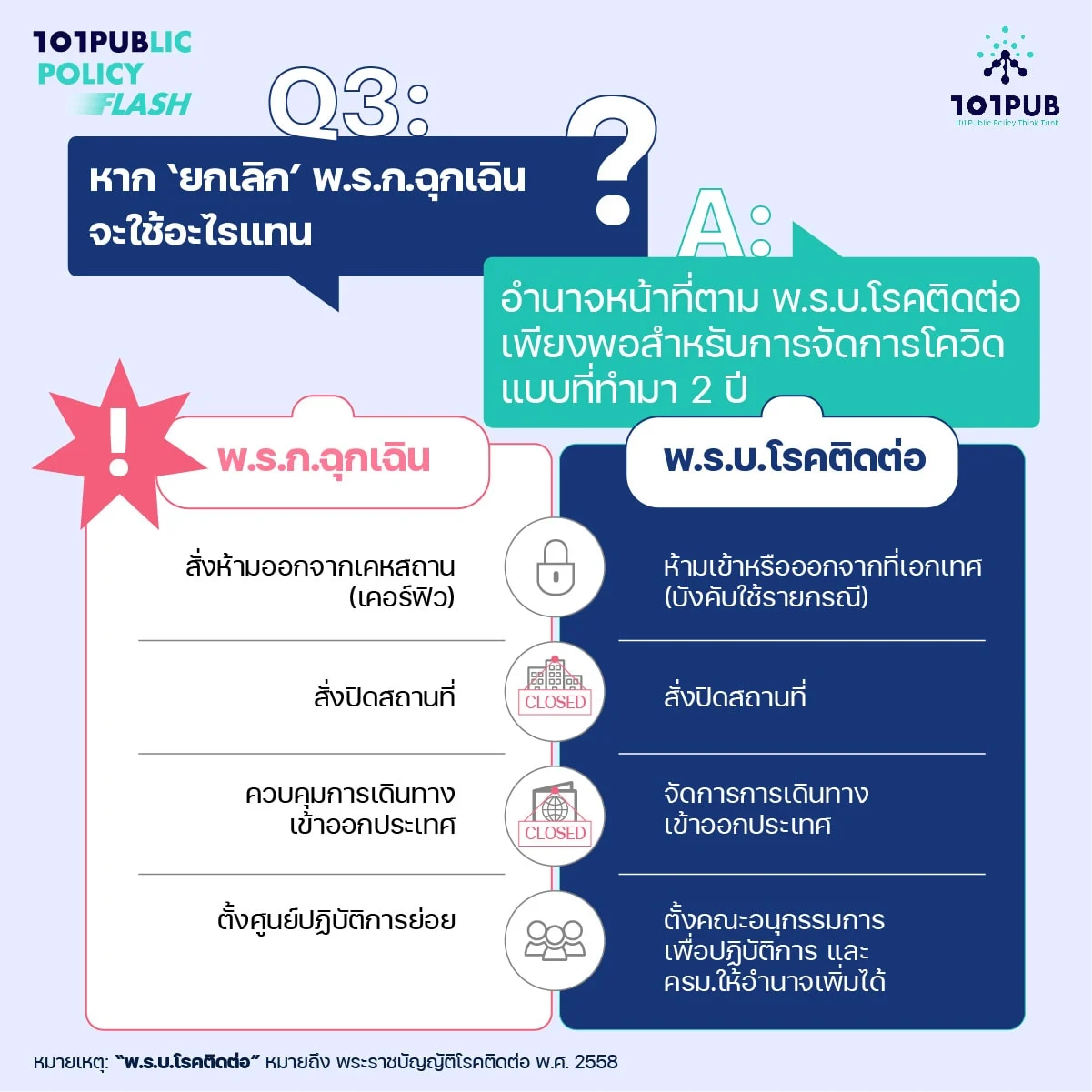 101PUB (101 Public Policy Think Tank) ชวนถกถามถึงความจำเป็นของการใช้ พ.ร.ก.ฉุกเฉิน ทบทวนประสิทธิภาพของกฎหมายนี้ในการควบคุมโรคระบาด ผลข้างเคียงต่อสิทธิเสรีภาพของประชาชน และทางเลือกที่ดีกว่าสำหรับการจัดการวิกฤตสาธารณะที่ไม่มีแนวโน้มว่าจะจบลงได้นี้