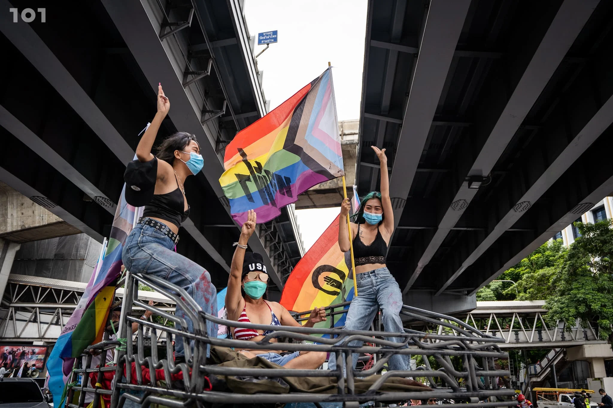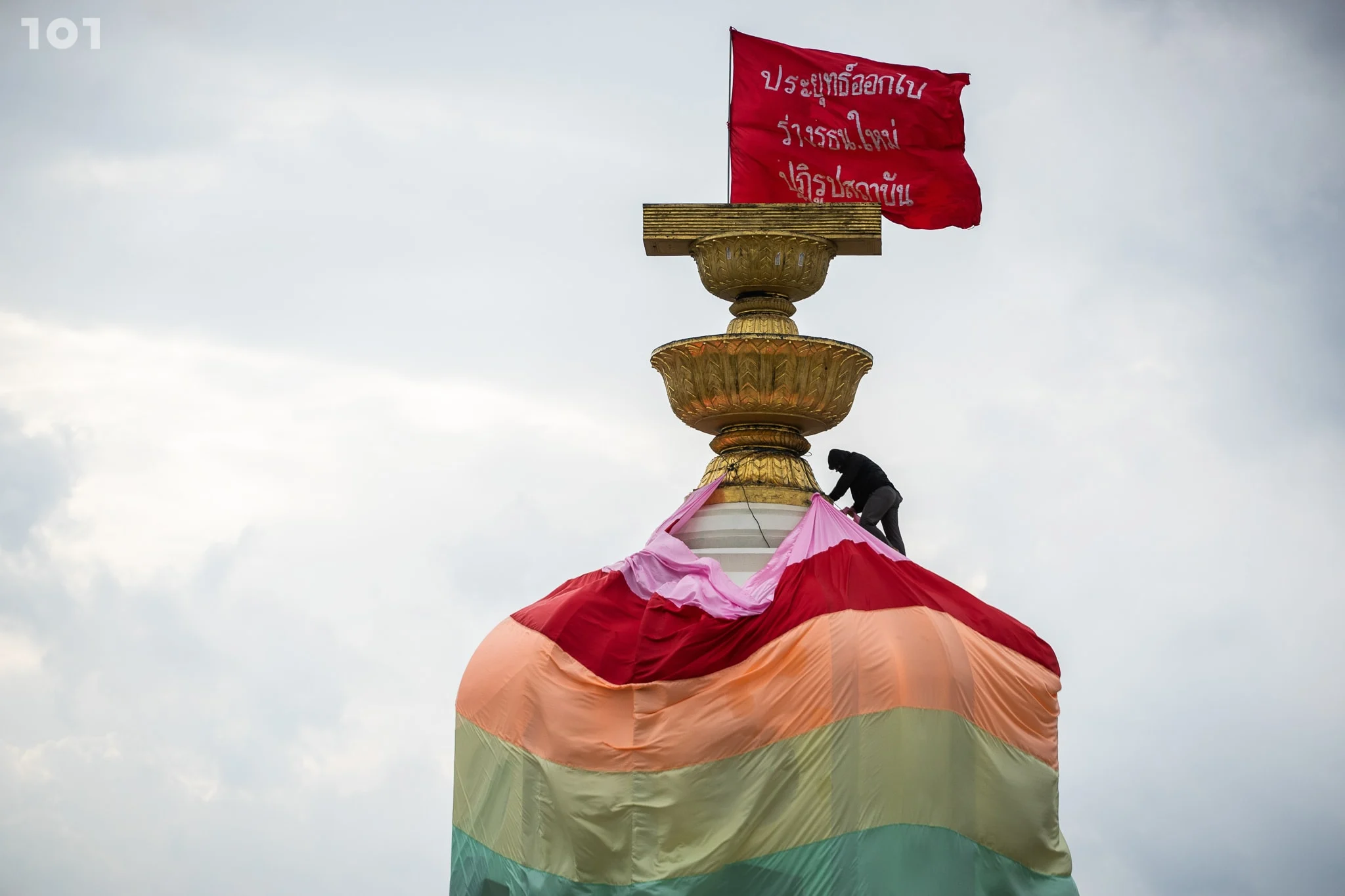 ก่อนที่ในเวลา 15.30 น. หัวขบวนคาร์ม็อบเดินทางมาถึงอนุสาวรีย์ประชาธิปไตย โดยมีตัวแทนผู้จัดกิจกรรมนำธงสีรุ้งขนาดใหญ่ขึ้นไปคลุมอนุสาวรีย์ประชาธิปไตย และผูกป้ายผ้าสีขาวกับปีกของอนุสาวรีย์ประชาธิปไตยพร้อมระบุข้อความว่า ‘ปิตาธิปไตยจงชิบหาย ความเป็นธรรมหลากหลายจงเจริญ’