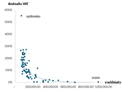 ถึงแม้สูตรจะมีความซับซ้อน แต่ผลโดยรวมแล้วช่วยลดความเหลื่อมล้ำสูง จังหวัดส่วนมากซึ่งมักกองกันอยู่ในกลุ่มจังหวัดรายได้น้อยได้จัดสรร VAT คืนเกิน 100% จังหวัดอย่างแม่ฮ่องสอนได้เงิน VAT คืนเกือบ 6 เท่าของ VAT ที่จัดเก็บได้ในจังหวัด (ตามภาพที่ 2)