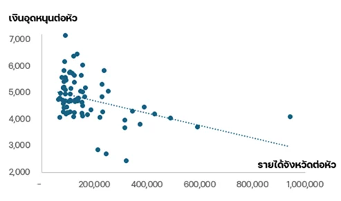 รายการเหล่านี้ทำให้ อปท. ในหลายจังหวัดที่มีรายได้น้อยได้งบอุดหนุนต่อประชากรมากเป็นพิเศษ ตามภาพที่ 3 งบก้อนที่รัฐอุดหนุนให้ อปท. จึงมีส่วนช่วยลดความเหลื่อมล้ำระหว่าง อปท. ในพื้นที่รวยและ อปท. ในพื้นที่ยากจนได้เล็กน้อย