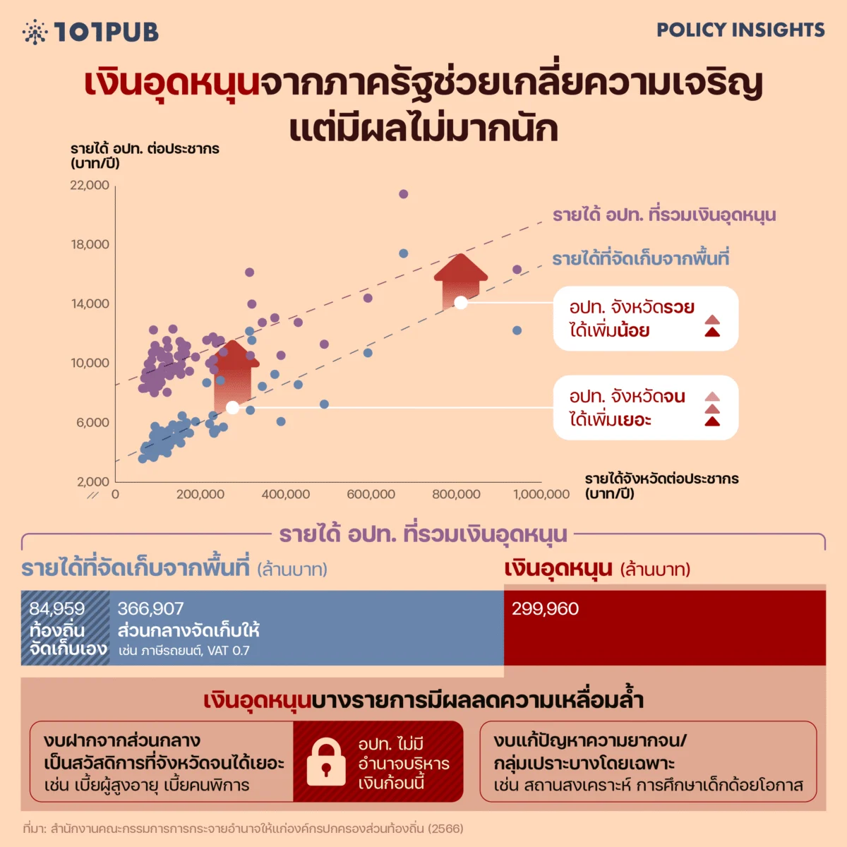 นอกจากรายได้ที่มาจากการจัดเก็บเองและรัฐจัดสรรให้แล้ว อปท. ยังมีรายได้อีกช่องทางหนึ่งคืองบที่รัฐส่วนกลางอุดหนุนให้ อปท. ซึ่งคิดเป็นกว่า 40% ของรายได้ อปท. ทั้งหมด โดยงบก้อนนี้มีหลายรายการที่ อปท. ในจังหวัดที่ยากจนมีแนวโน้มจะได้มากกว่า เช่น
