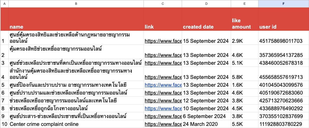 มิจฉาชีพที่แสร้งเป็นหน่วยงานช่วยเหยื่อบนเฟซบุ๊กคือส่วนหนึ่งของปัญหา เพื่อถอดรหัสอย่างที่เกริ่นไปก่อนหน้า ผู้เขียนตั้งต้นโดยการค้นหาเพจด้วยคีย์เวิร์ด ‘ศูนย์ช่วยเหลือเหยื่อออนไลน์’ ‘ช่วยเหยื่อออนไลน์’ และ ‘เหยื่ออาชญากรรมออนไลน์’ จากนั้นจึงสุ่มเลือก 10 เพจที่น่าสงสัย และทำการตรวจสอบชื่อ โปร์ไฟล์ เนื้อหา โฆษณา รวมถึงความสัมพันธ์ระหว่างเพจเหล่านี้ (เก็บข้อมูลเมื่อวันที่ 16 กันยายน 2024)
