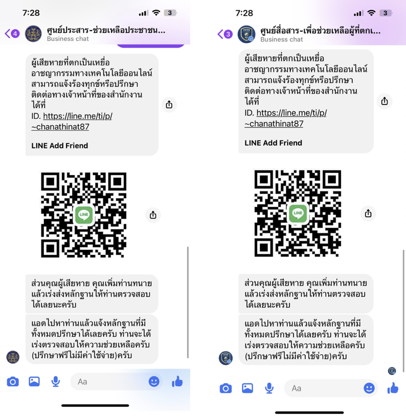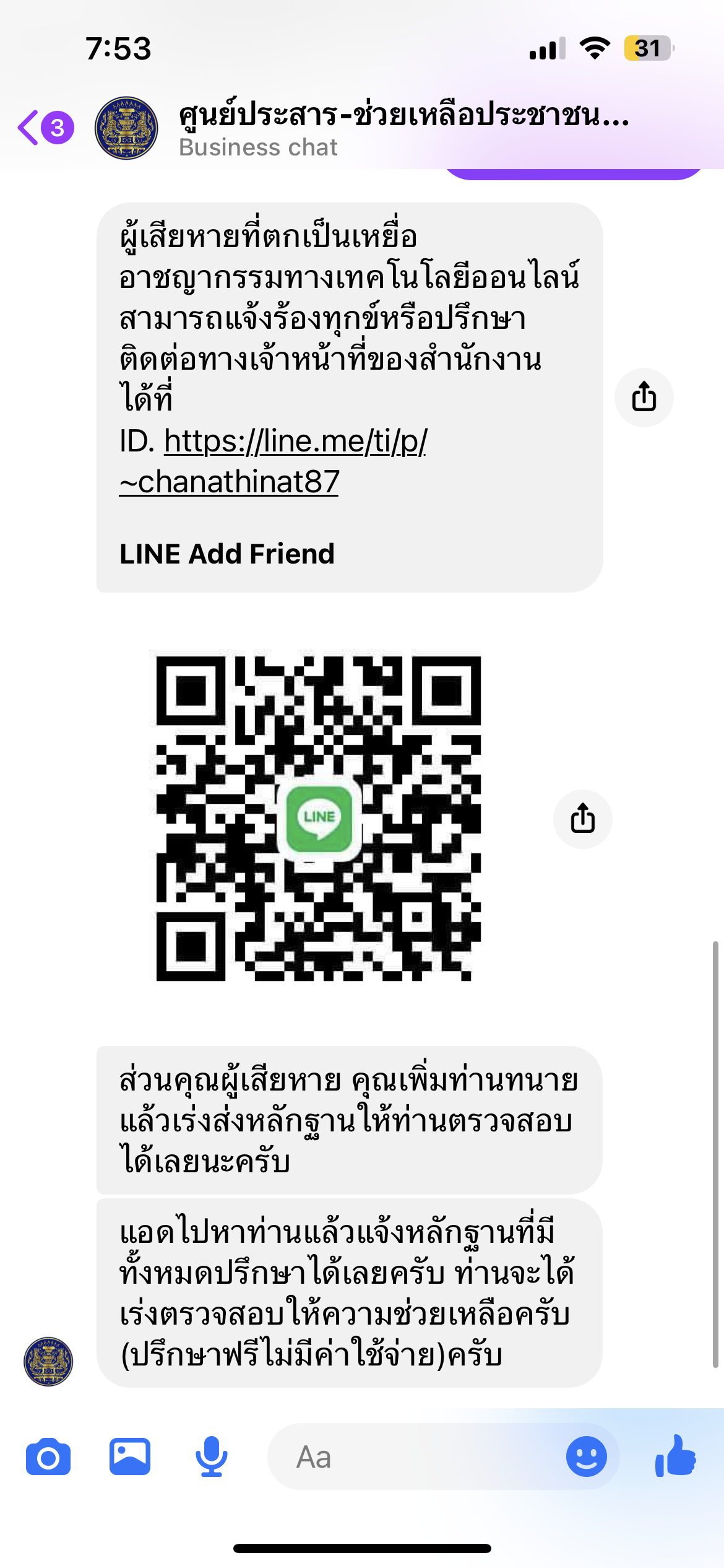 จากนั้น เพจจะส่งข้อความให้เพิ่มเพื่อนบนแอปพลิเคชันไลน์ (line) โดยอ้างว่าเพื่อพูดคุยและส่งหลักฐานแก่บุคคลที่อ้างว่าเป็นทนาย ซึ่งข้อความระบุว่า “ผู้เสียหายที่ตกเป็นเหยื่ออาชญากรรมทางเทคโนโลยีออนไลน์สามารถแจ้งร้องทุกข์หรือปรึกษาติดต่อทางเจ้าหน้าที่ของสำนักงานได้ที่ …” และ “แอดไปหาท่านแล้วแจ้งหลักฐานที่มีทั้งหมด ปรึกษาได้เลยครับ ท่านจะได้เร่งตรวจสอบให้ความช่วยเหลือครับ”