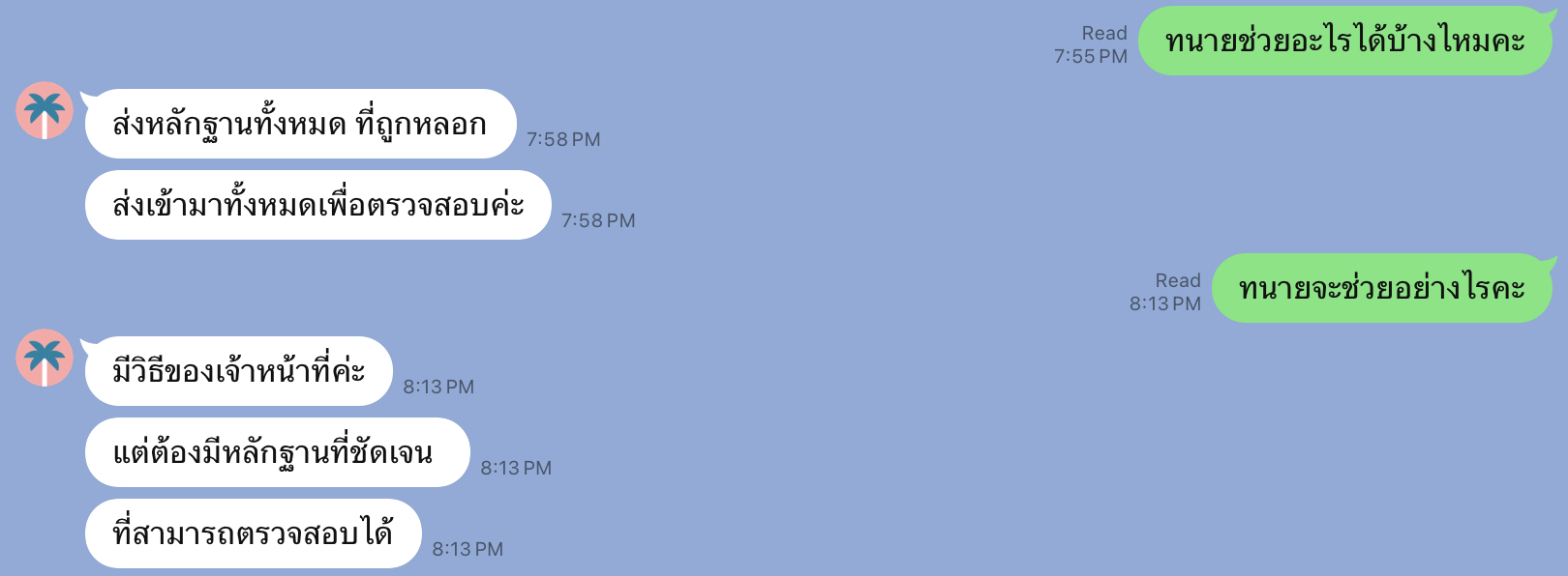 เมื่อผู้เขียนทดลองเพิ่มเพื่อนบนไลน์ ก็พบว่าบัญชีนั้นๆ อ้างตัวว่าเป็นทนายหญิงชื่อ ‘ชนาธินาถ’ ที่ก็มีรูปแบบบทสนทนาเดียวกัน กล่าวคือขอข้อมูลและหลักฐานการโดนหลอก ทั้งยังอ้างว่าสามารถช่วยเหลือเหยื่อด้วย “วิธีของเจ้าหน้าที่”