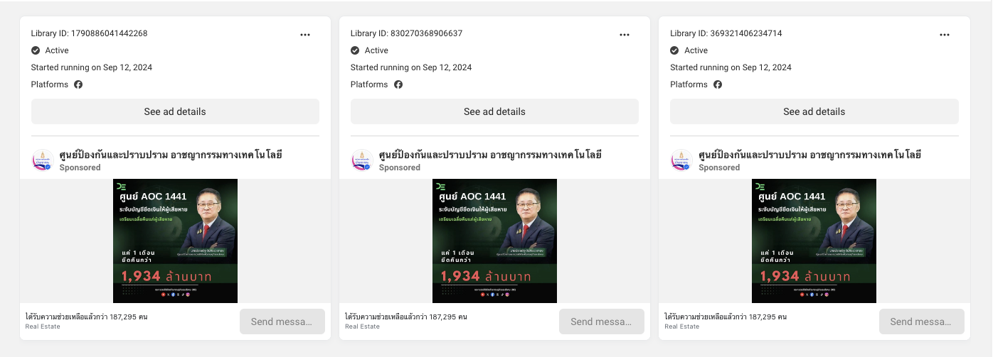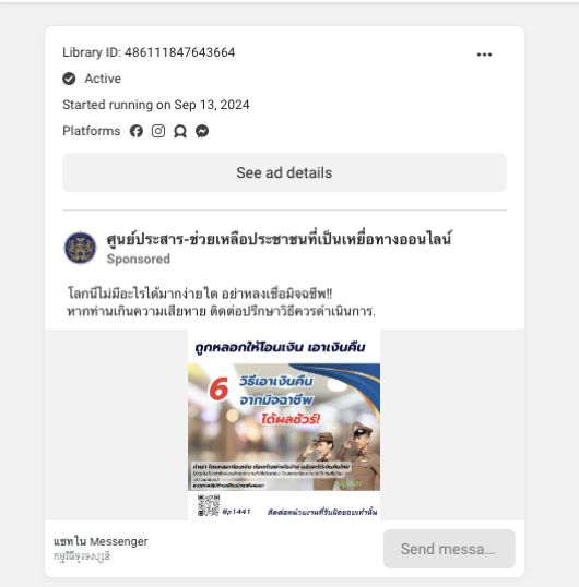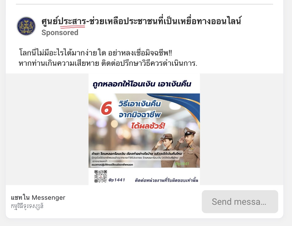 เช่น ภาพโฆษณาของเพจ ‘ศูนย์ประสาร-ช่วยเหลือประชาชนที่เป็นเหยื่อทางออนไลน์’ เขียนคำบรรยายว่า “หากท่านเกินความเสียหาย ติดต่อปรึกษาวิธีควรดำเนินการ” ขณะที่ในรูปมีภาพของตำรวจและมีเนื้อหาเรื่องวิธีเอาเงินคืนจากมิจฉาชีพ ทั้งนี้ ภายในรูปมีการแปะไอดีไลน์ @p1441 ที่ดูใกล้เคียงกับ @police1441 ซึ่งเป็นแชตบอต (โปรแกรมแชตตอบกลับอัตโนมัติ) ไลน์สำหรับปรึกษาคดีอาชญากรรมออนไลน์โดยตำรวจจริงด้วย