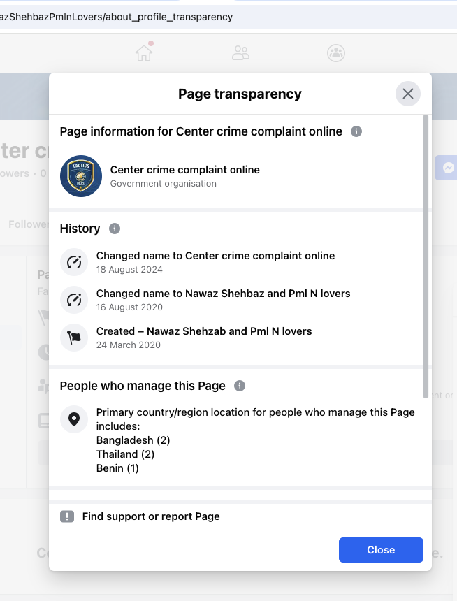 ถัดมาคือประวัติการเปลี่ยนชื่อเพจและการมีผู้ดูแลเพจที่อาศัยอยู่นอกประเทศ บางเพจผ่านการเปลี่ยนชื่อและมีผู้ดูแลเพจในต่างประเทศ ตามภาพด้านล่างจะเห็นว่าเพจ ‘Center crime complaint online’ มีประวัติเคยใช้ชื่อเพจ ‘Nawaz Shehbaz and Pml N lovers’ มาก่อน นอกจากนี้ยังมีผู้บริหารเพจที่อาศัยอยู่ต่างประเทศ เช่น ประเทศเบนิน อันเป็นประเทศในทวีปแอฟริกา เป็นต้น ซึ่งปฏิเสธไม่ได้อีกเช่นกันว่าไม่สมเหตุสมผล เพราะคงจะแปลกไม่น้อยหากเพจให้ความช่วยเหลือเหยื่อคดีออนไลน์ของรัฐมีประวัติเปลี่ยนชื่อเพจ (แถมชื่อเดิมก็เป็นอะไรที่ไม่คุ้นหู) ทั้งยังมีแอดมิน (admin) หรือผู้ดูแลเพจที่อาศัยอยู่นอกประเทศด้วย