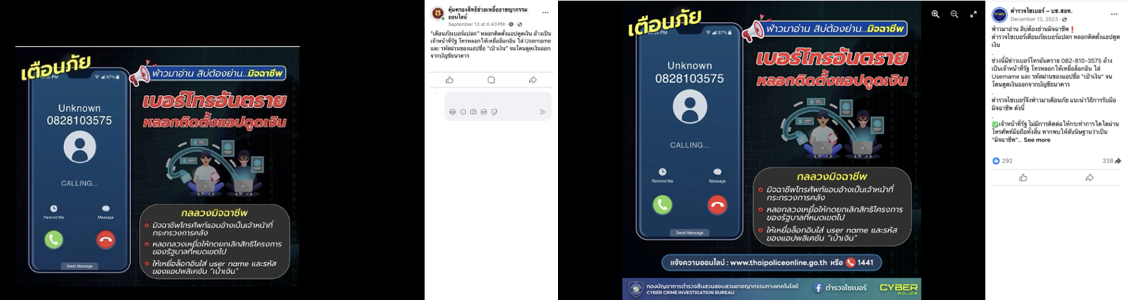 โพสต์ของเพจน่าสงสัยเมื่อวันที่ 13 กันยายน 2024 (ซ้าย) โพสต์จากเพจจริงของตำรวจไซเบอร์เมื่อวันที่ 13 ธันวาคม 2023 (ขวา) ทั้งนี้ เพจน่าสงสัยโพสต์ภาพเดียวกับเพจตำรวจไซเบอร์ แต่ตัดแถบโลโก้ด้านล่างสุดออก