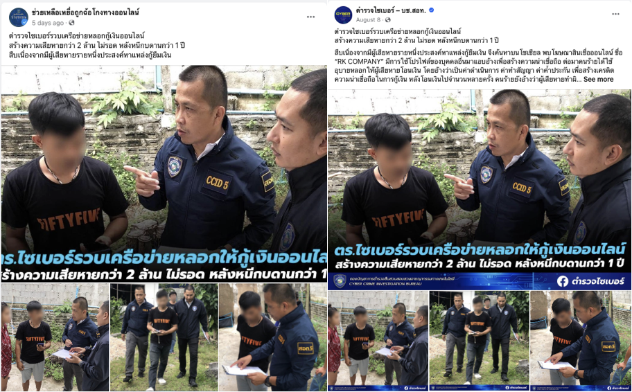 โพสต์ของเพจน่าสงสัยเมื่อวันที่ 11 กันยายน 2024 (ซ้าย) โพสต์จากเพจจริงของตำรวจไซเบอร์เมื่อวันที่ 8 สิงหาคม 2024 (ขวา) โพสต์ของเพจน่าสงสัยโพสต์มีการตัดแถบโลโก้ด้านล่างสุดออกเช่นกัน