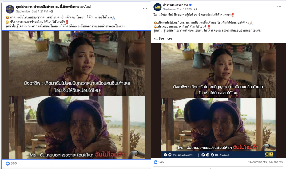 มีมของเพจน่าสงสัยเมื่อวันที่ 6 กันยายน 2024 (ซ้าย) มีมจากเพจจริงของตำรวจสอบสวนกลางเมื่อวันที่ 2 กันยายน 2024 (ขวา) โพสต์ของเพจน่าสงสัยโพสต์มีการตัดแถบโลโก้ด้านล่างสุดออกเช่นกัน