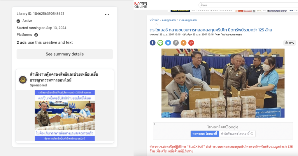 ย้ำอีกครั้งว่าเพจน่าสงสัยมักนำภาพและคลิปของเหตุการณ์ที่ ‘ดูจะเกี่ยวข้อง’ มาประกอบโฆษณา หากสังเกตให้ดีจะพบว่าบางเพจใช้ภาพและคลิปที่ไม่สัมพันธ์กับเนื้อหาของเพจ อย่างกรณีเพจ ‘สำนักงานคุ้มครองสิทธิและช่วยเหลือเหยื่ออาชญากรรมทางออนไลน์’ มีโฆษณาที่ระบุว่าหากตกเป็นเหยื่อก็ขอรับสิทธิผ่านออนไลน์ได้เลย แต่เมื่อนำภาพไปสืบค้นก็พบว่าต้นทางของภาพมาจากการแถลงข่าวตำรวจไซเบอร์ทลายขบวนการหลอกลงทุนคริปโตที่เตรียมนำทรัพย์สินที่ยึดได้มาเฉลี่ยคืนผู้เสียหายของคดี