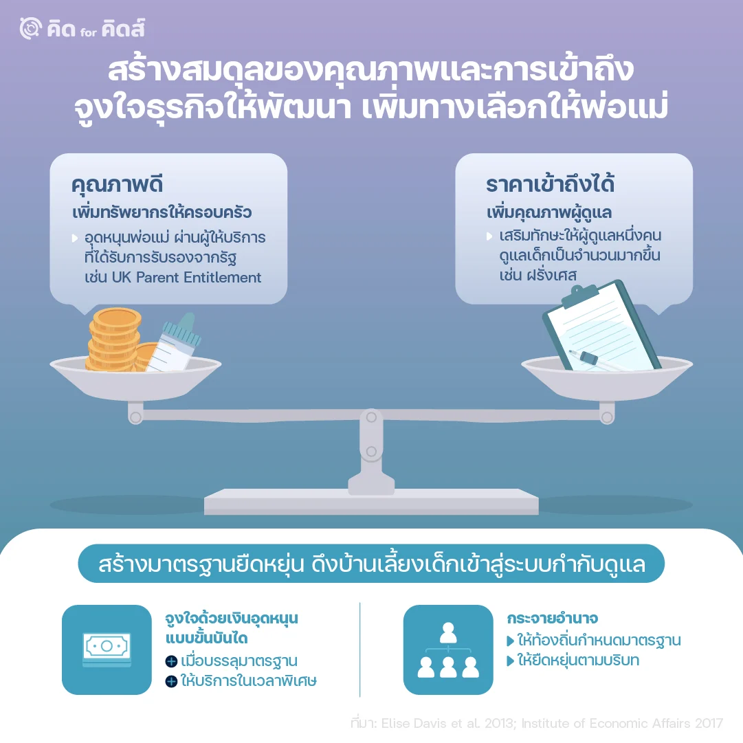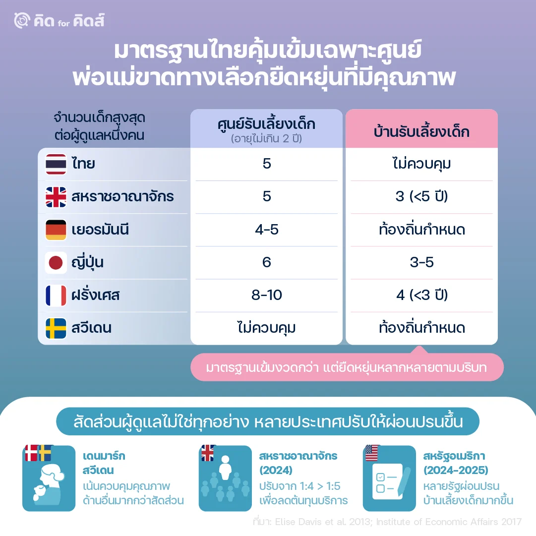 มาตรฐานแห่งชาติของไทยในปัจจุบันจึงทั้งเข้มงวดและหย่อนยานไปในเวลาเดียวกัน เนื่องจากกำกับดูแลเฉพาะสถานรับเลี้ยงที่เป็นทางการ แต่กลับปล่อยให้ธุรกิจรับดูแลเด็กที่บ้านให้บริการโดยไร้การควบคุมคุณภาพ บีบให้พ่อแม่ต้องเลือกระหว่างบริการคุณภาพดีราคาแพง หรือเสี่ยงดวงกับบริการยืดหยุ่นราคาประหยัด ตัวอย่างในต่างประเทศแสดงให้เห็นว่า เส้นแบ่งระหว่างการรับดูแลเด็กมืออาชีพกับการดูแลในครอบครัวไม่สามารถขีดให้ชัดเจน และควรต้องมีการเข้าไปกำกับดูแลอย่างเหมาะสมและสอดคล้องกับสภาพความเป็นจริงในแต่ละพื้นที่