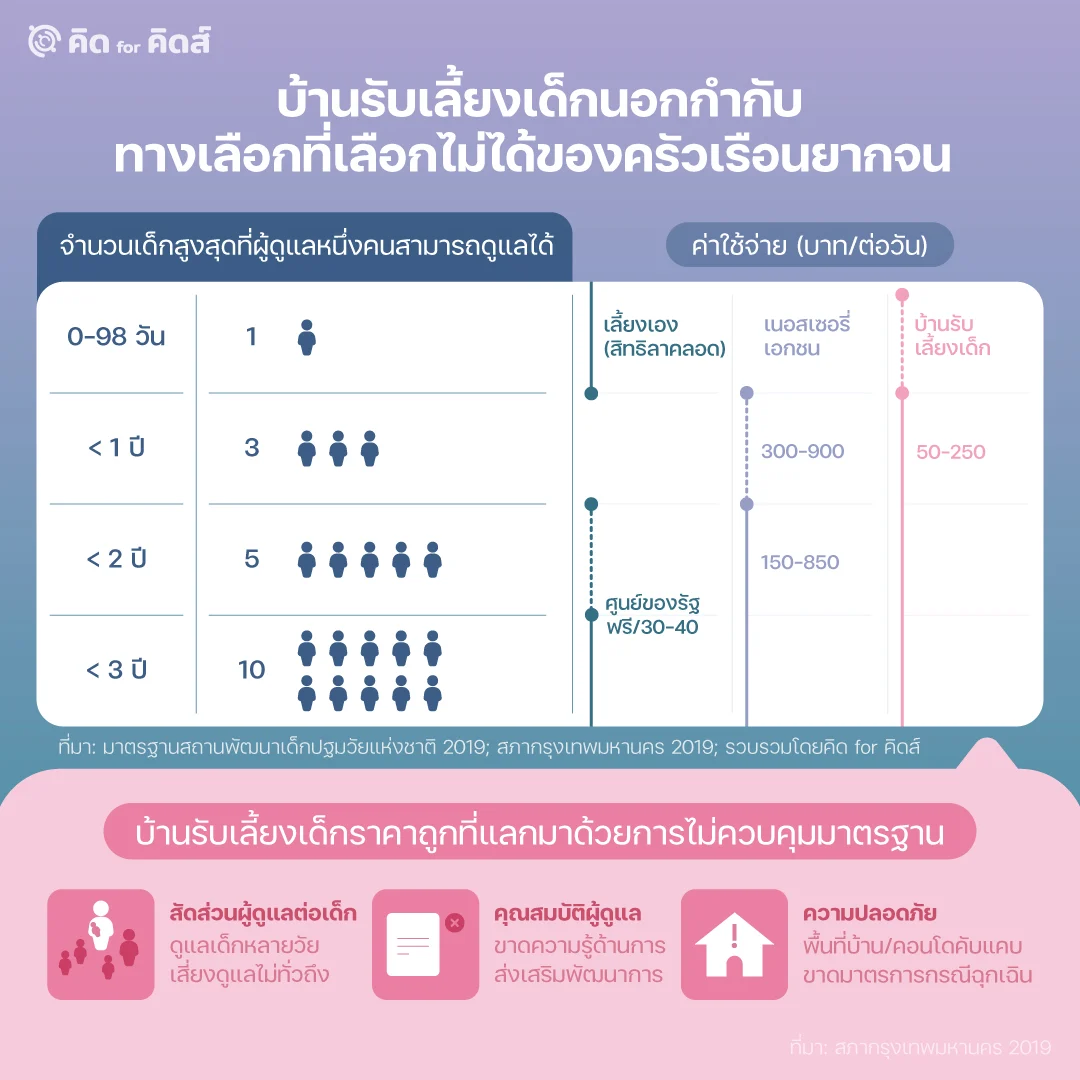บทบาทของบ้านรับเลี้ยงเด็กจึงไม่ได้เป็นแค่ธุรกิจที่เติมเต็มช่องว่างการดูแลเด็กเล็ก แต่ยังเป็นด่านหน้าที่ช่วยแบกรับภาระงานคุ้มครองเด็กในครัวเรือนเปราะบางเอาไว้ด้วย ตอกย้ำว่ารัฐยิ่งต้องยื่นมือเข้ามาช่วยดูแล ทั้งในเชิงกำกับควบคุมและสนับสนุนให้บ้านเหล่านี้ไม่ต้องดูดซับภาระหนักอึ้งไว้ด้วยตัวเอง