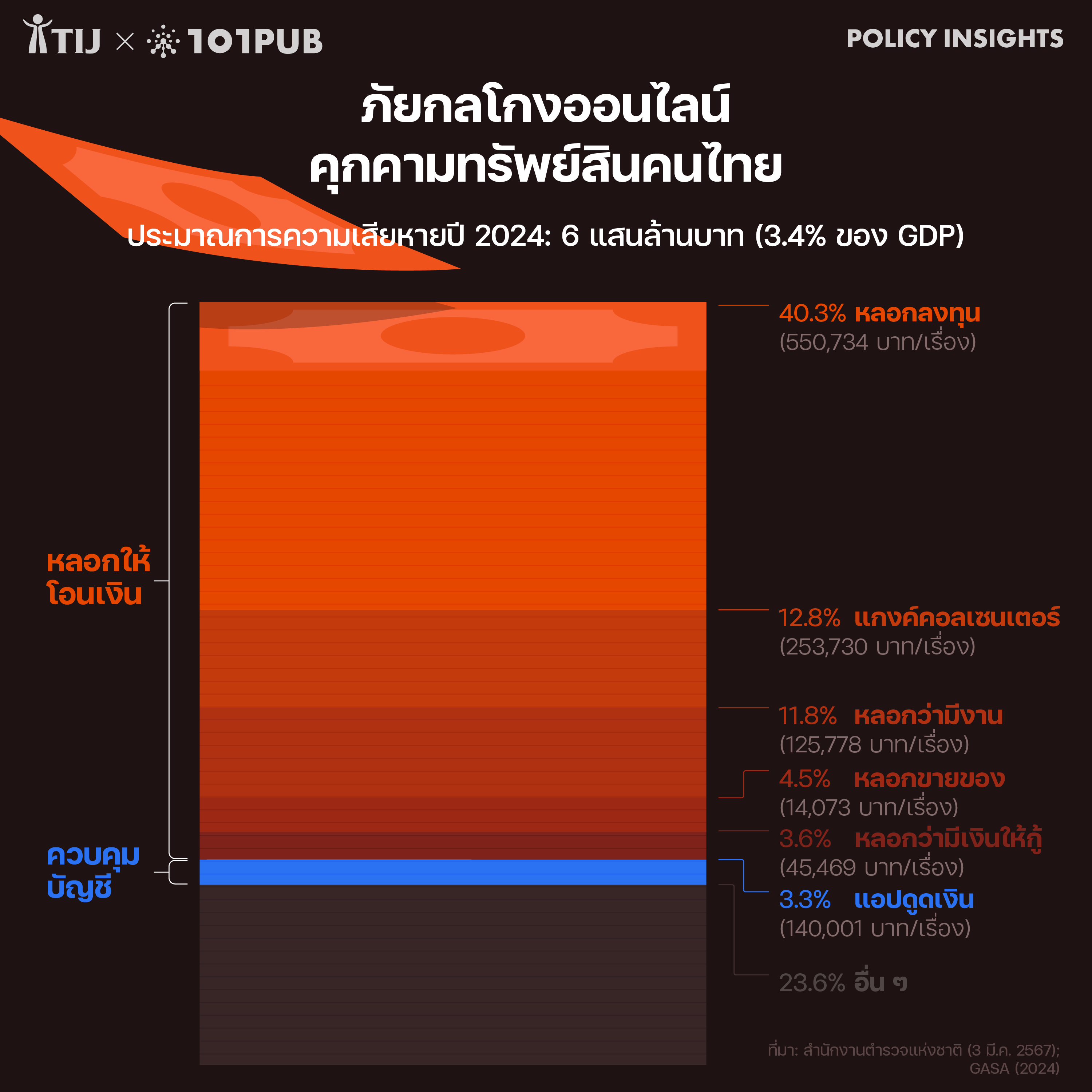 ข้อมูลการสำรวจสถานการณ์การโกงออนไลน์ในไทยปี 2024 ประมาณการว่า คนไทยสูญเสียจากการถูกหลอกลวงออนไลน์เกือบ 600,000 ล้านบาท คิดเป็นประมาณ 3.4% ของ GDP[1] สัดส่วนความเสียหายนี้นับว่าสูงเป็นอันดับต้นๆ ของโลก โดยอาจมีคนไทยมากถึงราว 18-20 ล้านคนที่เคยสูญเสียทรัพย์สินจากการถูกหลอกลวงทางออนไลน์[2]