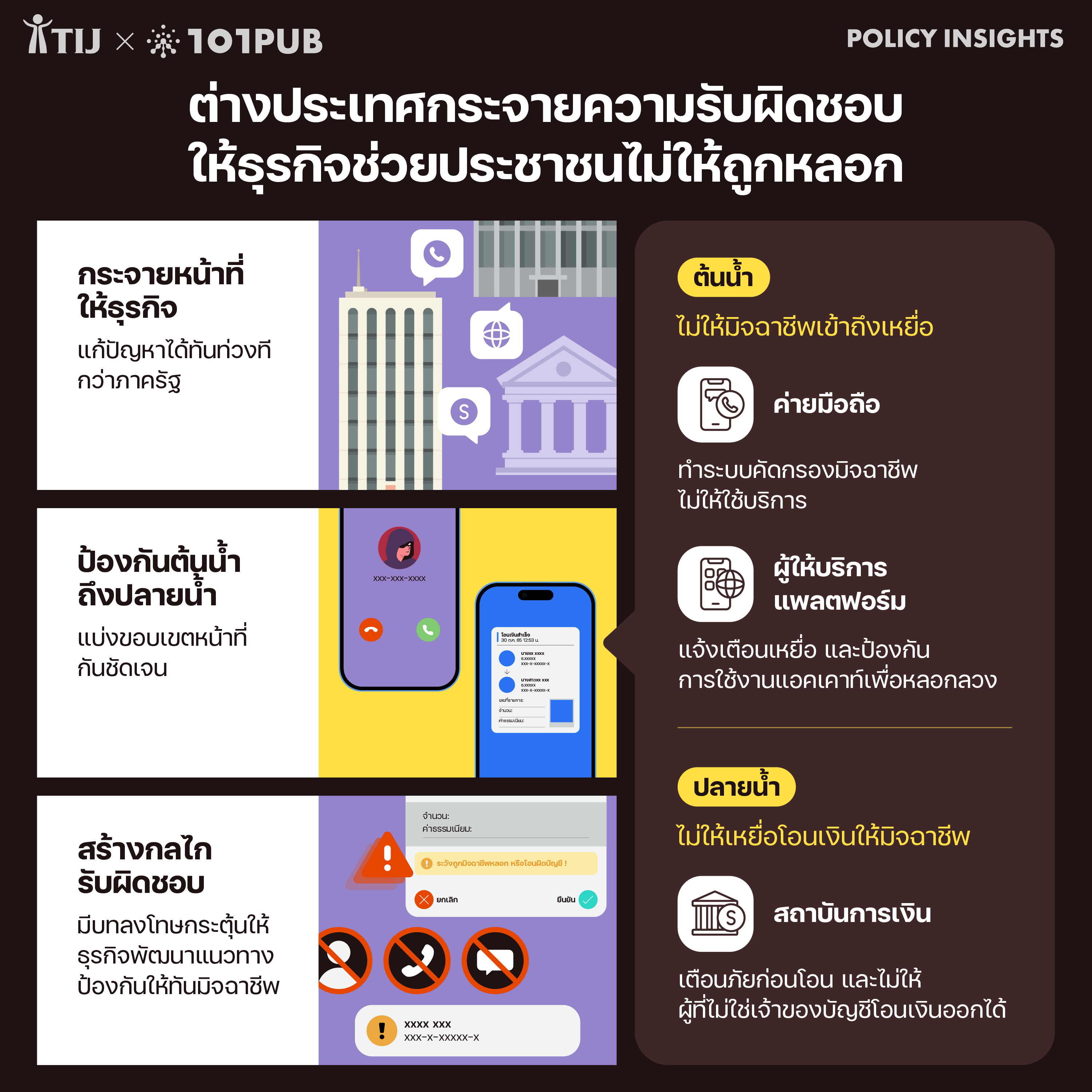 ประการที่สอง รัฐต้องแบ่งหน้าที่ให้ธุรกิจดูแลตั้งแต่ต้นน้ำจนถึงปลายน้ำของกระบวนการหลอกลวง การที่มิจฉาชีพจะหลอกลวงเอาเงินมาจากเหยื่อได้ต้องพึ่งพาหลายบริการจากภาคธุรกิจ ทั้งบริการการสื่อสารเพื่อติดต่อเข้าหาเหยื่อ (ต้นน้ำ) ตลอดจนบริการทางการเงินเพื่อรับเงินโอนจากเหยื่อ (ปลายน้ำ) ดังนั้น จึงต้องให้ธุรกิจในแต่ละส่วนช่วยป้องกัน