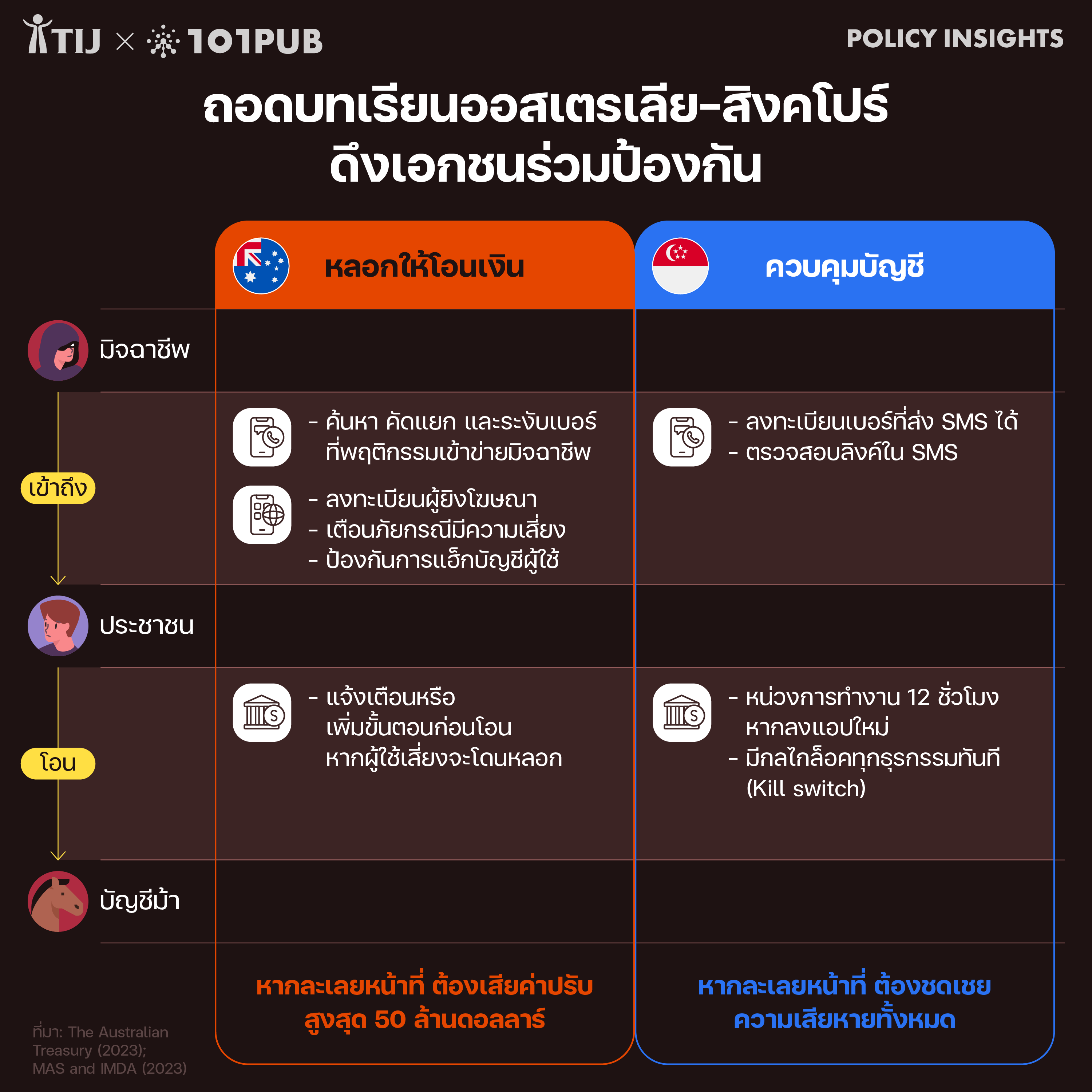 จุดเด่นสำคัญของแนวทางออสเตรเลียคือการออกแบบที่กำหนดหน้าที่ความรับผิดชอบที่กระจายตัวไปหลายภาคส่วน ซึ่งครอบคลุมทั้ง ค่ายมือถือ บริษัทแพลตฟอร์ม และสถาบันการเงิน