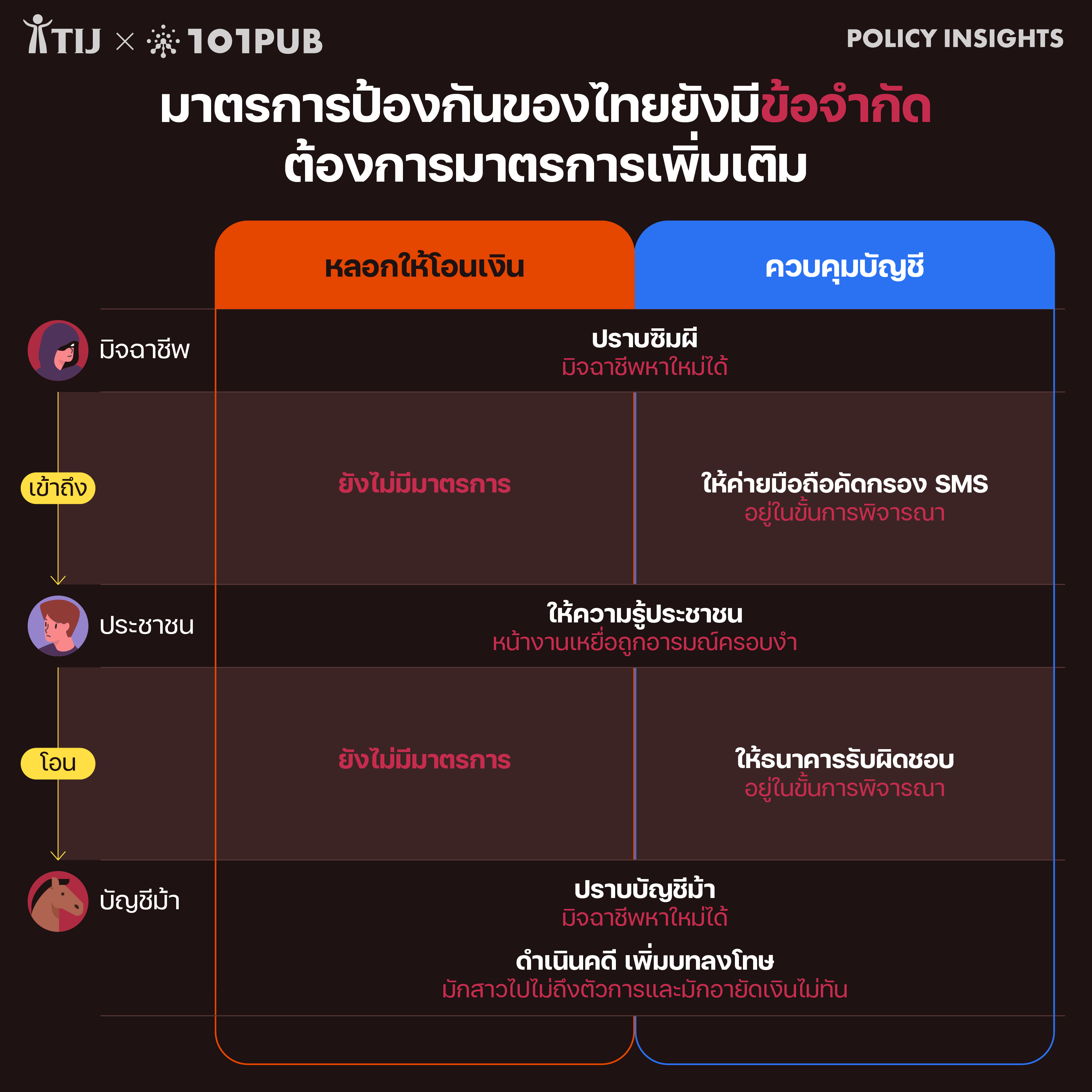 โดยปกติแล้ว มิจฉาชีพมักหลีกเลี่ยงการถูกจับกุมด้วยการใช้เบอร์และบัญชีธนาคารที่ลงทะเบียนในชื่อผู้อื่น (ซิมผีและบัญชีม้า) ในการโจรกรรม ภาครัฐจึงมองว่าการปราบปรามซิมผีและบัญชีม้าจะมีผลทำให้มิจฉาชีพทำงานยากมากขึ้น และคาดว่าการหลอกลวงจะลดน้อยลง