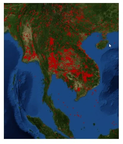 แผนที่แสดงให้เห็นจุดที่มีไฟไหม้ ระหว่างวันที่ 1-7ธันวาคม 2561 | ที่มา https://firms.modaps.eosdis.nasa.gov/map/#z:5;c:108.2,13.8;