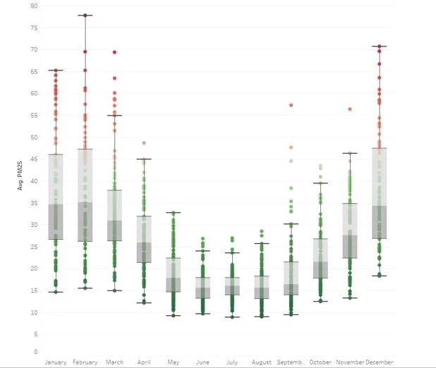 ข้อมูลค่าเฉลี่ยรายวันของระดับฝุ่น PM 2.5 ในกรุงเทพ ในแต่ละเดือน (ข้อมูลปี 2016-2019) | ที่มา ผู้เขียน, ข้อมูลจาก Berkeley Earth (http://berkeleyearth.lbl.gov/air-quality/local/Thailand/Bangkok/Bangkok)