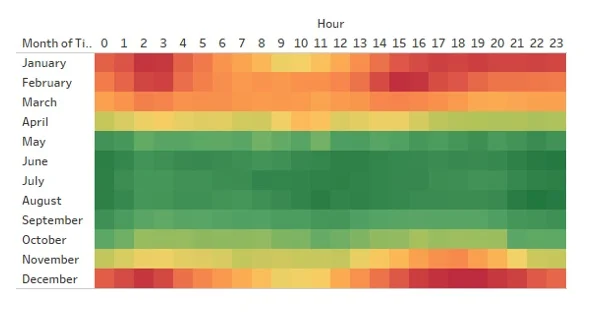 ค่าเฉลี่ยของฝุ่น PM 2.5 ในกรุงเทพ ในแต่ละชั่วโมงและเดือน (ข้อมูลปี 2016-19) | ที่มา ผู้เขียน, ข้อมูลจาก Berkeley Earth (http://berkeleyearth.lbl.gov/air-quality/local/Thailand/Bangkok/Bangkok)