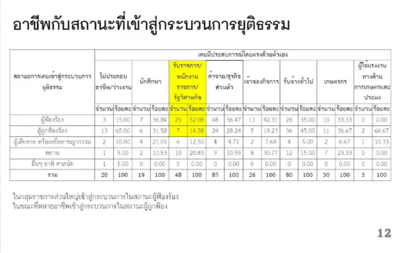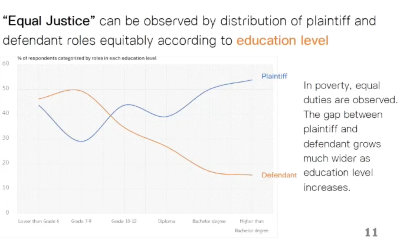 ข้อมูลดังกล่าวยิ่งสำทับความยุ่งยากของกระบวนการยุติธรรมไทย ซึ่งทำให้ความเข้าใจระเบียบและเอกสารที่ซับซ้อน ตลอดจนความสามารถในการติดต่อหน่วยงานที่หลากหลายและการมีเครือข่ายผู้ให้ความช่วยเหลือ กลายเป็นข้อได้เปรียบในการบริโภคความยุติธรรม