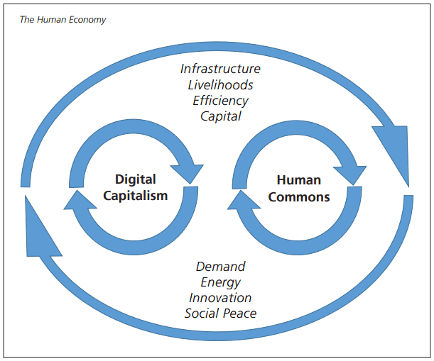 Human Economy ประกอบด้วยเศรษฐกิจ 2 ส่วนผสมผสานกัน ได้แก่ เศรษฐกิจทุนนิยมดิจิทัล (Digital Capitalism) และเศรษฐกิจพลังคนเพื่อสาธารณะ (Human Commons)