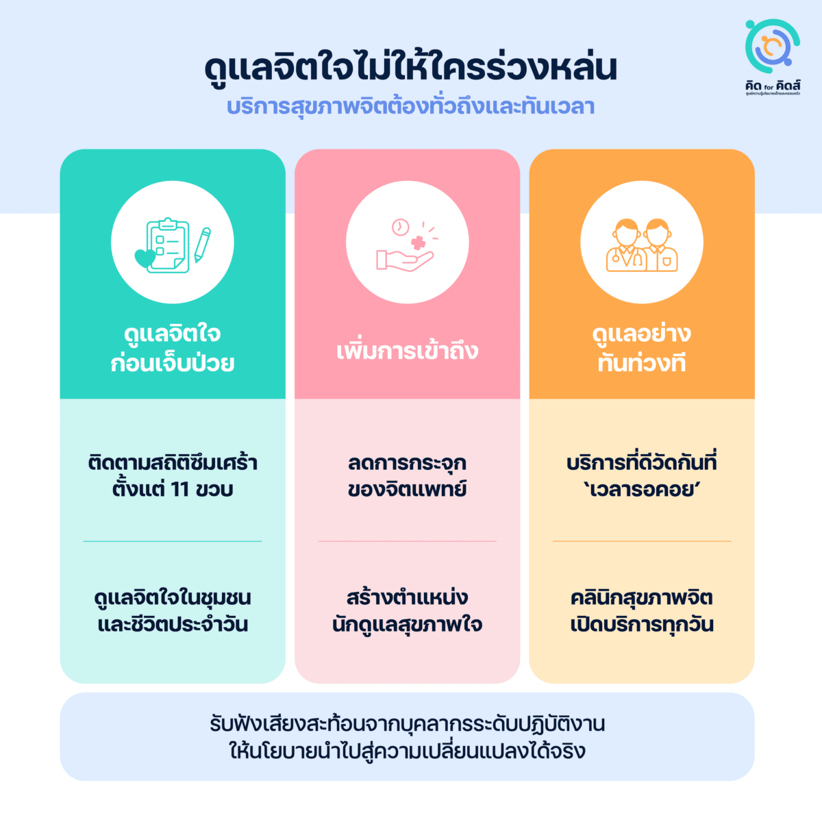 คิด for คิดส์ โดยความร่วมมือระหว่าง 101 PUB กับ สสส. ชวนตั้งคำถามและหาคำตอบ ทำไมผู้ป่วยซึมเศร้าไทยจึงไม่นับรวมเด็กอายุต่ำกว่า 15? ทำไมถึงมีผู้ป่วยเข้าถึงบริการเกิน 100%? แผนสุขภาพจิตตามยุทธศาสตร์ 20 ปีตอบโจทย์แล้วหรือยัง? การเพิ่มจิตแพทย์จะช่วยแก้ปัญหาได้จริงหรือไม่? ระบบบริการสุขภาพจิตที่ดีควรเป็นอย่างไร? ในมุมของคนทำงานคิดเห็นอย่างไรบ้าง? ตัวเลขสถิติต่างๆ เชื่อถือได้มากน้อยเพียงใด?