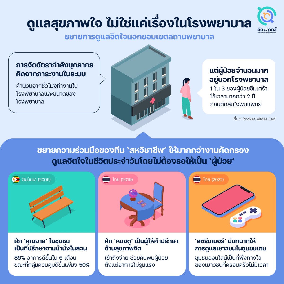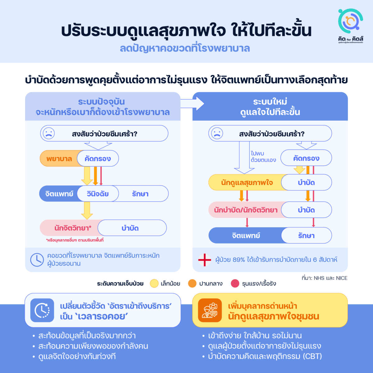 - พิจารณาสร้างตำแหน่ง ‘นักดูแลสุขภาพใจชุมชน’ เพื่อให้การดูแลในระดับพื้นฐาน ออกแบบระบบดูแลอย่างเป็นลำดับขั้นให้ผู้ป่วยได้รับการบำบัดด้วยการพูดคุยแต่เนิ่น ลดภาระคอขวดที่แพทย์
