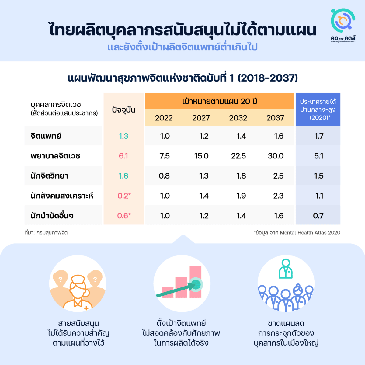 การให้บริการทางสาธารณสุขด้านจิตเวชของไทยได้รับการพัฒนาอย่างต่อเนื่องเพื่อรับมือกับปัญหาสุขภาพจิตในภาพรวม ในปี 2022 ไทยมีจิตแพทย์ 845 คน คิดเป็นสัดส่วน 1.28 คนต่อแสนประชากร อย่างไรก็ตาม สัดส่วนระดับประเทศยังคงแฝงไว้ด้วยความเหลื่อมล้ำในระดับภูมิภาค แม้จะมีจิตแพทย์ประจำในโรงพยาบาลครบทุกจังหวัดแล้ว แต่สัดส่วนของจิตแพทย์ในหลายจังหวัดยังคงห่างจากเป้าหมายตามแผนค่อนข้างมาก