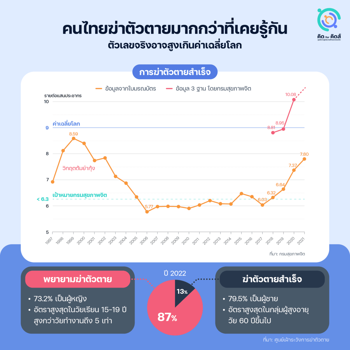 ที่ผ่านมาสถิติการฆ่าตัวตายถูกอ้างอิงจากใบมรณบัตร แต่ผลวิจัยพบว่าตัวเลขที่แท้จริงสูงกว่านั้นมาก กรมสุขภาพจิตจึงพัฒนาฐานข้อมูลที่สอบทานข้อมูลจาก 3 ฐาน ประเมินว่าอัตราการฆ่าตัวตายสำเร็จในปี 2021 จากฐานข้อมูลเดิม 7.37 ต่อแสนประชากร ความจริงแล้วอาจสูงถึง 10.08 ต่อแสนประชากร[1] ซึ่งเป็นตัวเลขที่สูงกว่าค่าเฉลี่ยโลกและสูงกว่าเป้าหมายของกรมอย่างมาก กระทั่งตัวเลขจากใบมรณบัตรเองก็เพิ่มสูงสุดในรอบ 18 ปี กล่าวได้ว่าไทยกำลังเผชิญวิกฤตด้านสุขภาพจิตครั้งใหม่ที่อาจรุนแรงและกินเวลายาวนานทำนองเดียวกับในช่วงวิกฤต ‘ต้มยำกุ้ง’ เมื่อปี 1997 ซึ่งทำให้อัตราการฆ่าตัวตายพุ่งสูงเป็นเวลา 7 ปีจึงกลับลงมาอยู่ในระดับเดิม